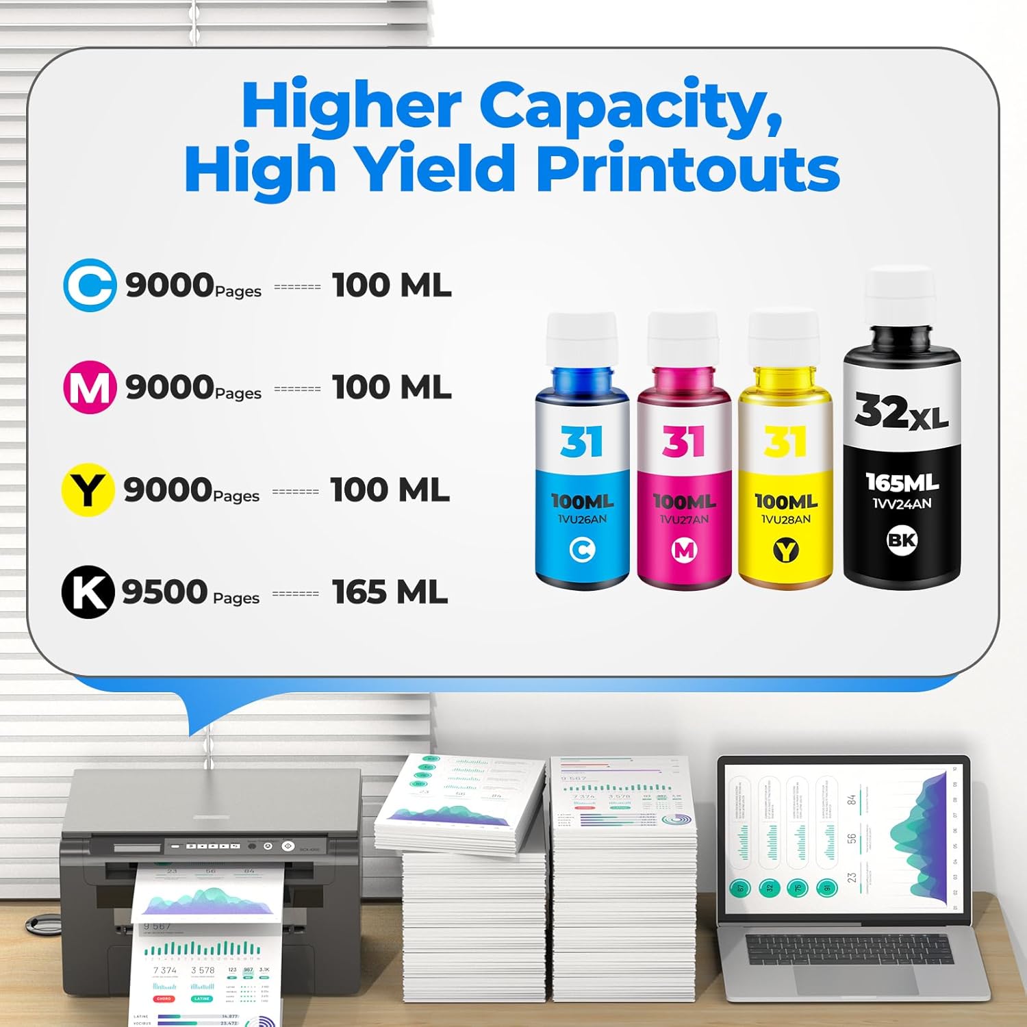 • About the Page Yield: These smart tank inks are high capacity 31 32xl inks and can print more printouts. At 5% coverage on A4 paper, 9500 pages for 32xl black ink bottle, 9000 pages for cyan 31 ink bottle, 9000 pages for yellow ink 31 bottle, and 9000 pages for magenta 31 ink bottle. The replacements for smart tank 5101 ink bottles, smart tank 7602 ink bottles, smart tank 5000 ink bottles, smart tank 651 ink bottles, smart tank 7001 ink bottles, smart tank 7301 ink bottles, smart tank 5103 ink