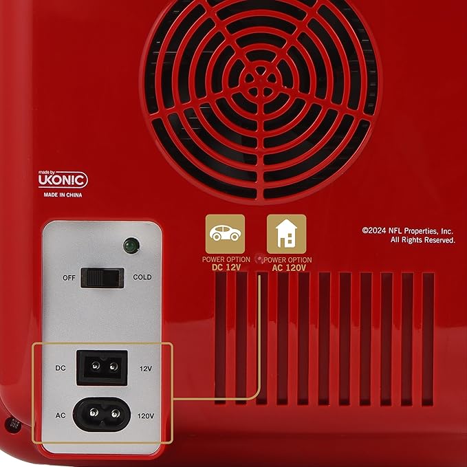 Ukonic NFL San Francisco 49ers 15-Can Mini Fridge 10L – AC/DC Powered, Official Team Colors & Logo, Portable Cooler for Tailgates, Home, Office, or Car
