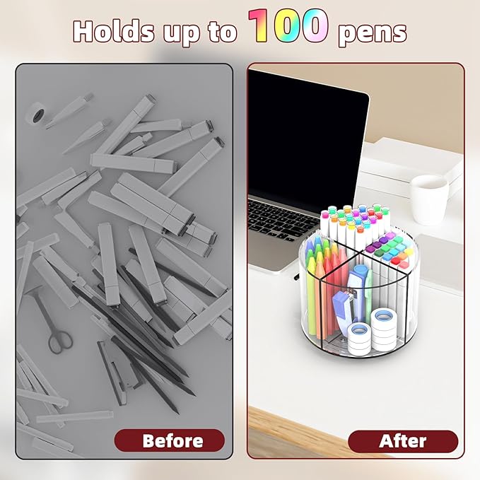 • 4 Compartments Storage Capacity - Don't let its slim profile fool you! The acrylic pen holder features multiple compartments and slots, providing ample storage space for all your writing essentials. Say goodbye to desk clutter and hello to organized efficiency.360 degree rotation function pencil holder for desk is not only perfect for sorting pens, pencils, color pens, crayons, markers, art supplies tools, makeup brush, etc.