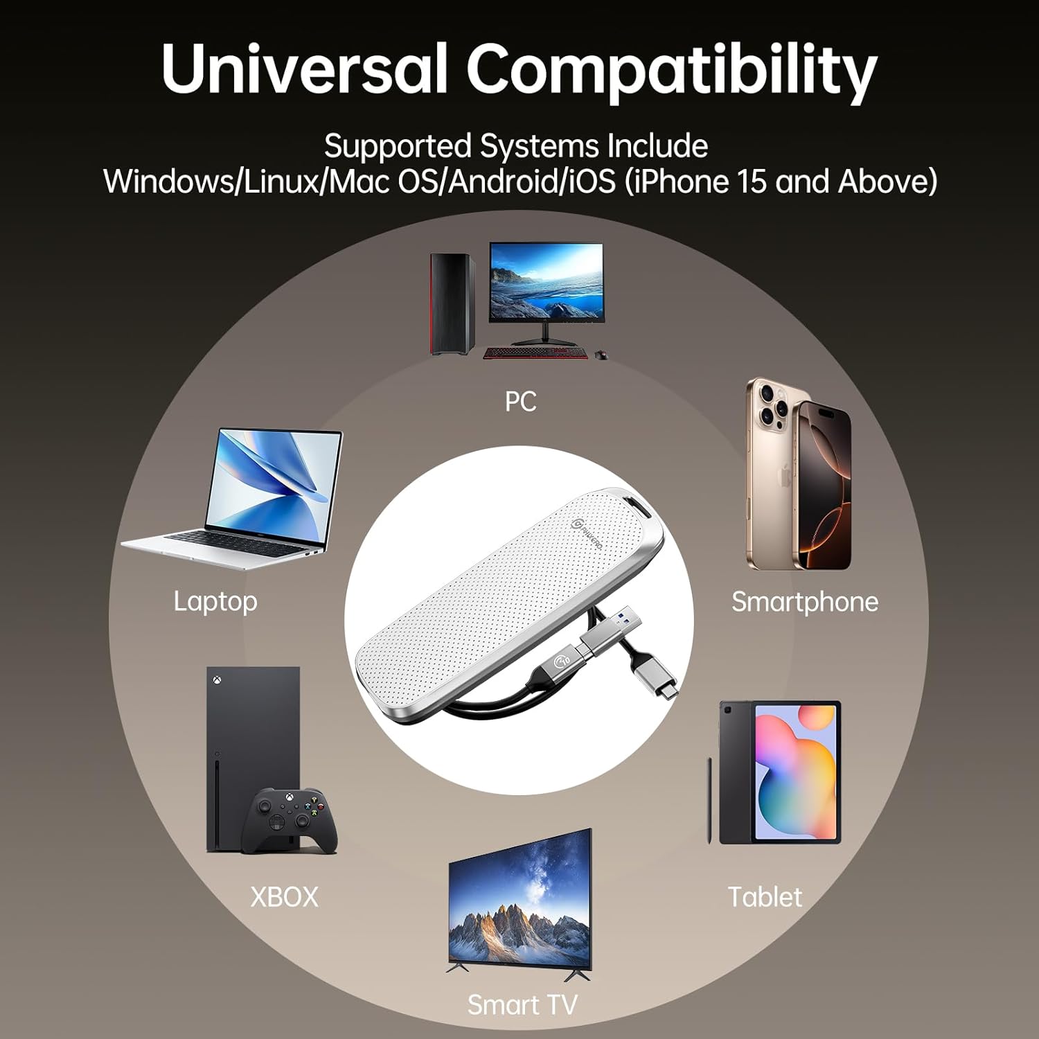 • UNIVERSAL COMPATIBILITY, ZERO CONFIGURATION: Features a reversible Type-C interface and includes a high-quality 0.3m 2-in-1 USB C to USB C & USB A cable. Plug and play support for iPhone 15 & newer, Android, Windows, Mac OS, Linux, with no drivers required. Perfectly for laptops, tablets, smartphones, cameras, gaming consoles and more.
