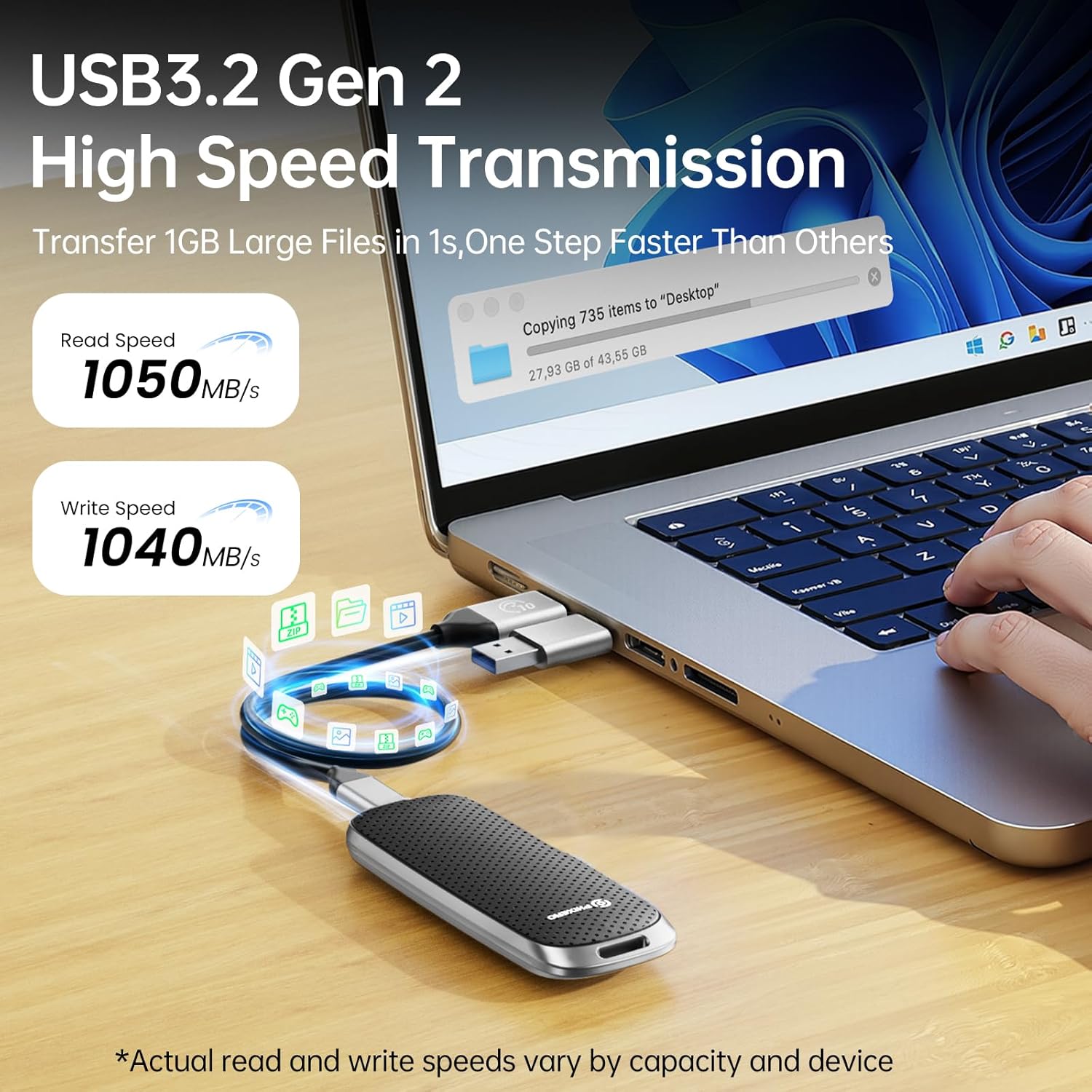 • ULTRAFAST PERFORMANCE, INSTANT TRANSFERS: Equipped with USB 3.2 Gen2 interface, this P10PRO External NVMe SSD 2TB supports up to 10Gbps high speed data transmission, achieving real world read speeds up to 1050MB/s and write speeds up to 1040MB/s. Transfer 1GB of data in just one second, ideal for 4K video editing, game libraries and large business files, dramatically improving work efficiency.