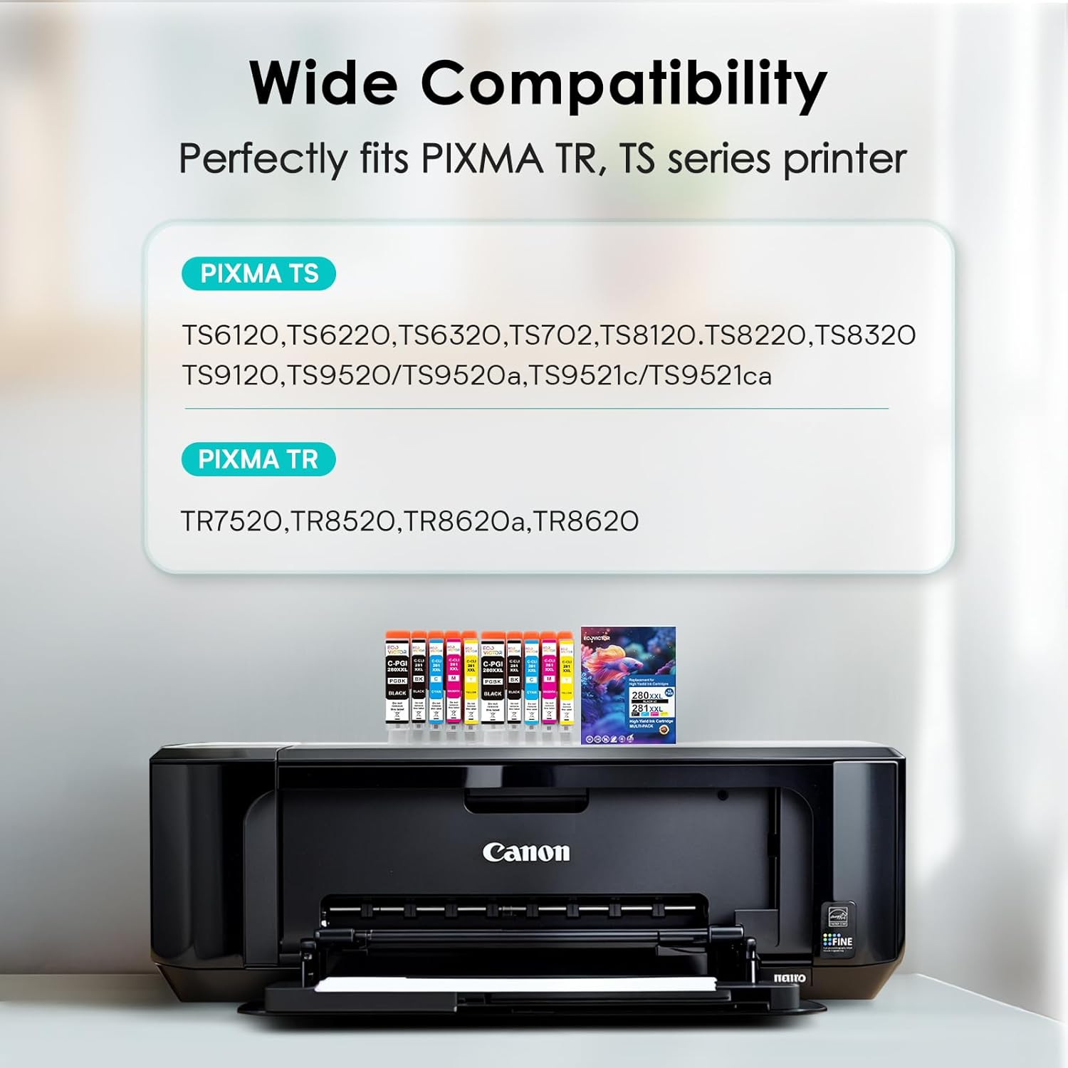 • 280XXL 281XXL Ink Cartridges for Canon Printers List: 280 281 ink cartridge Compatible with canon pixma TR8620a TR8620 TR8520 TR8500 TR7520 TR7500 TS6100 TS6120 TS6200 TS6220 TS6300 TS6320 TS702 TS8120 TS8100 TS8220 TS8200 TS8320 TS8300 TS9120 TS9100 TS9520 TS9520a TS9521c TS9521ca (please confirm your printer).