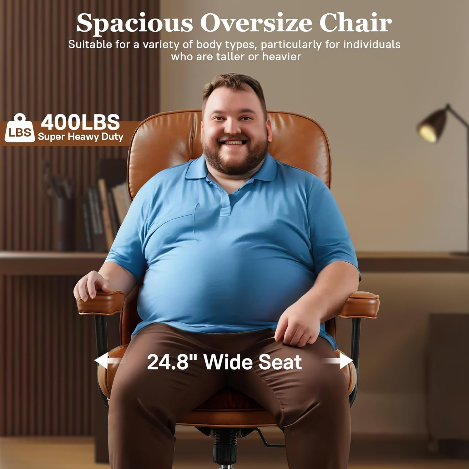 Mid Century Modren Big and Tall Office Chair,Large Ergonomic Executive Chair for Heavy Duty People, Computer Desk Task Chair with Wheels, Faux Lether Fabric Wide Chair for Home Sturdy,Brown(PU)