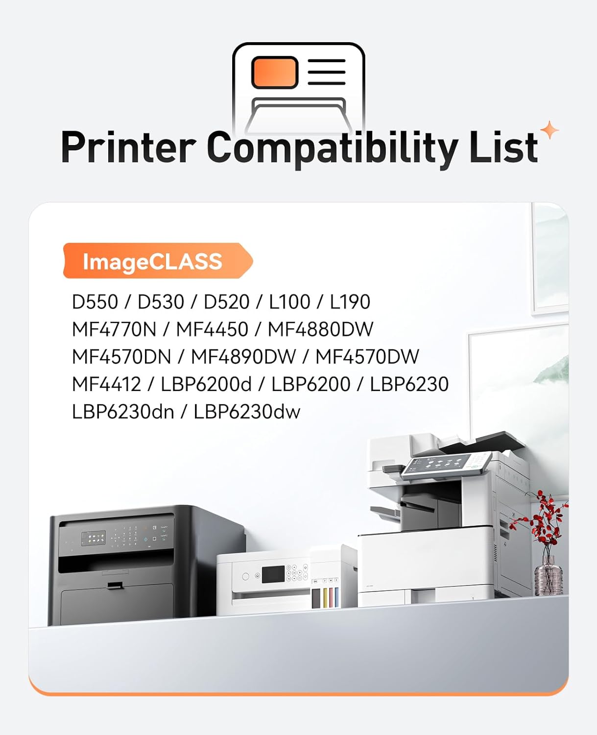 • Compatible Printers: Compatible with Canon imageCLASS D550 D530 D520 Faxphone L100 L190, ImageCLASS MF4770N MF4450 MF4880DW MF4570DN MF4890DW MF4570DW MF4412 LBP6200d LBP6200 LBP6230 LBP6230dn LBP6230dw Series Printer.