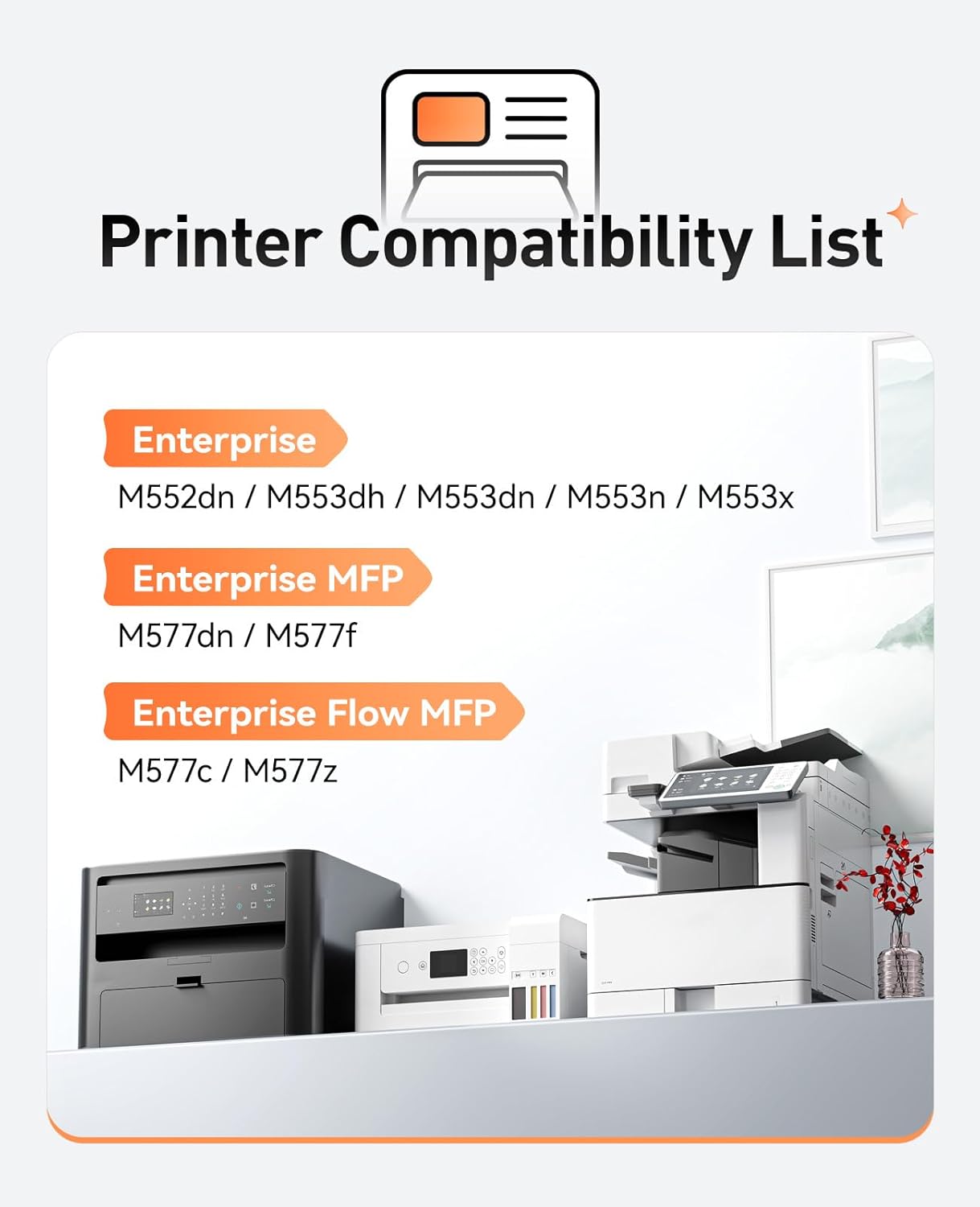 • Compatible Devices : Compatible for HP Color LaserJet Enterprise Flow MFP M577c, M577z; HP Color LaserJet Enterprise M552dn, M553dh, M553dn, M553n, M553x; HP Color LaserJet Enterprise MFP M577dn, M577f Series Printer. Compatible for HP Color LaserJet Enterprise Flow MFP M577c, M577z; HP Color LaserJet Enterprise M552dn, M553dh, M553dn, M553n, M553x; HP Color LaserJet Enterprise MFP M577dn, M577f Series Printer.