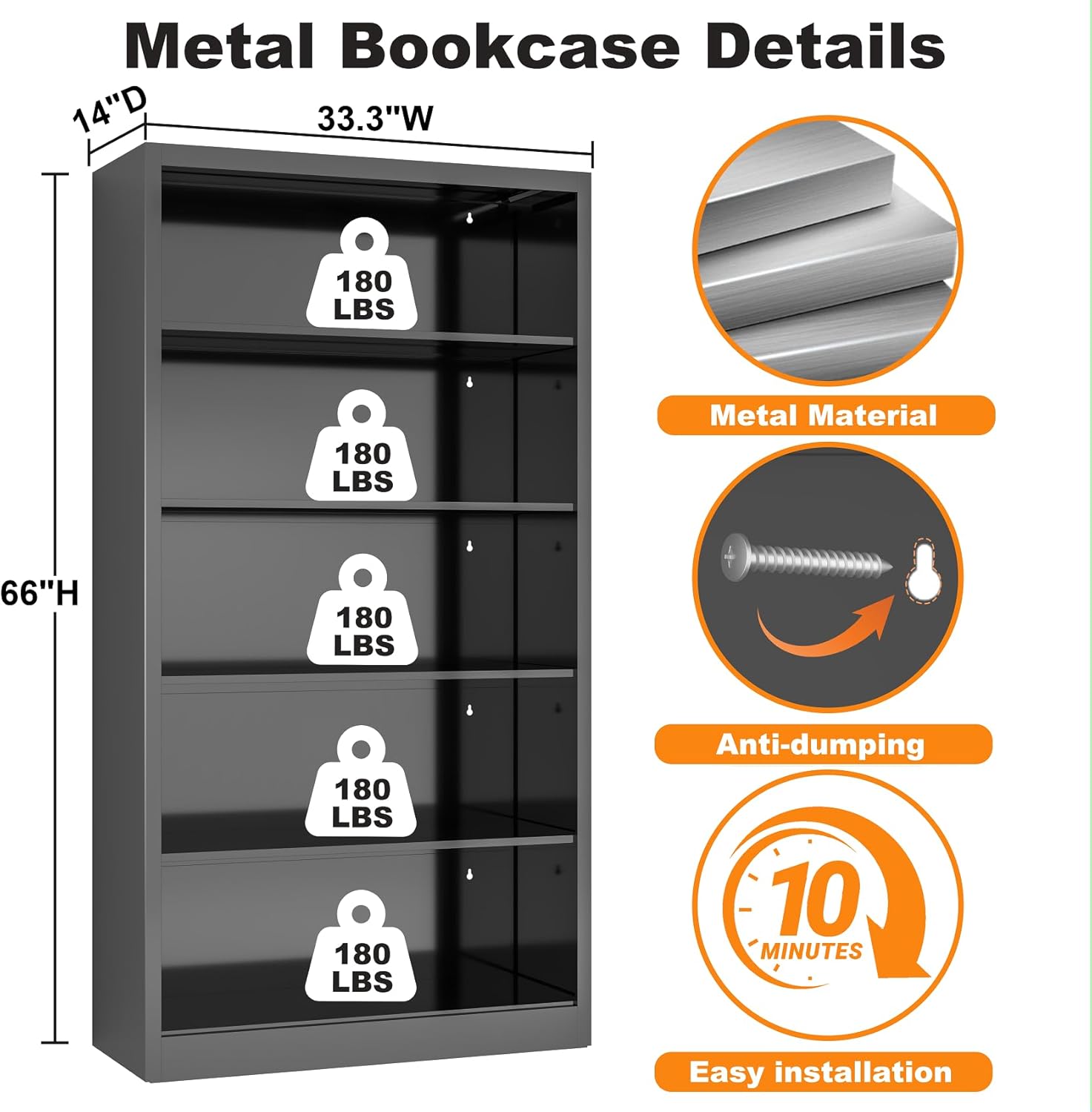 5 Tier Metal Bookshelf, 66" Tall Bookcase, Adjustable Book Shelves, Modern Black Book Shelf Storage Shelves for Bedroom, Living Room, Office, Library, Classroom, School