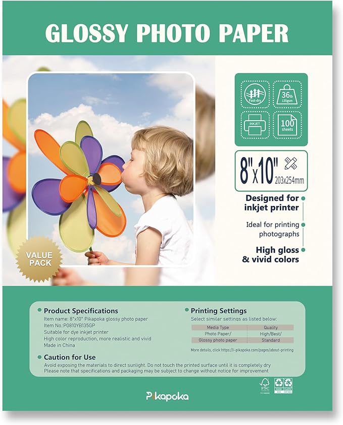 • Pikapoka thin glossy photo paper 36lb(135gsm), size: 8x10 in, 100 Pack