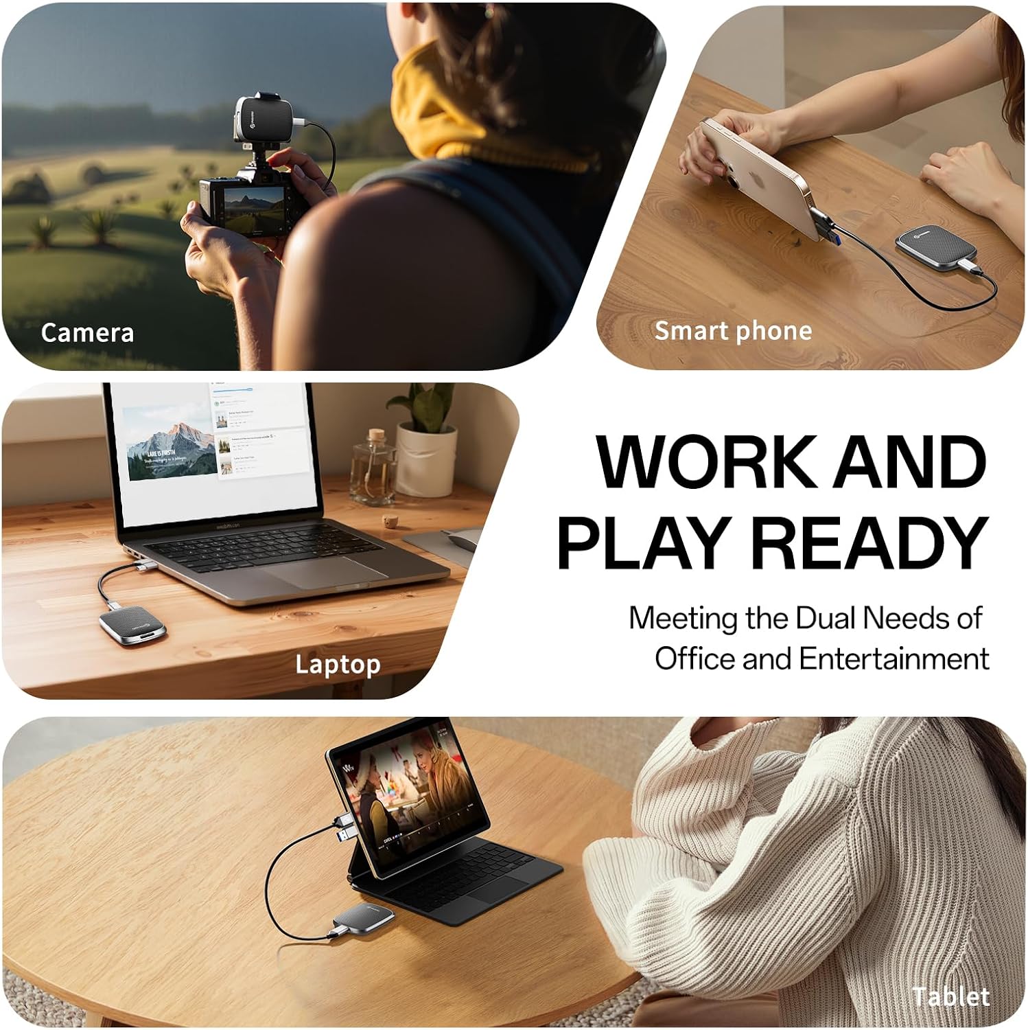 • 【Seamless cross-device use】 Whether you are working or creating for entertainment, you can control your content at any time through your smartphone, PC and other devices with the USB C&A cable. You can connect the PHIXERO P5PLUS Portable SSD to your devices without any operation. It is convenient for everyone to use their mobile phones to directly read files for file sharing, data transmission, and video playback while working or studying.