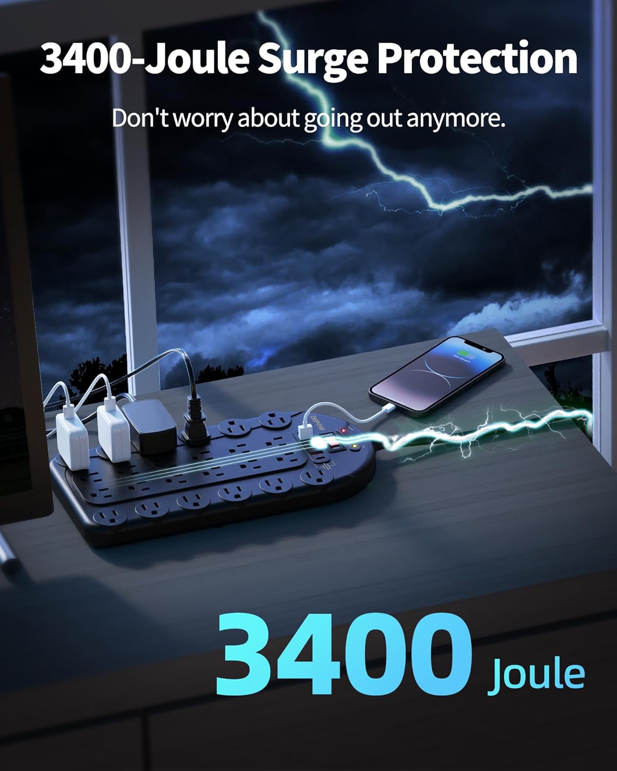 • 【Safeguard Your Devices】-This long outlet power strip has a 3400-Joule energy rating providing a reliable surge protector to protect any meeting room, office, personal workstation, or urround sound system.