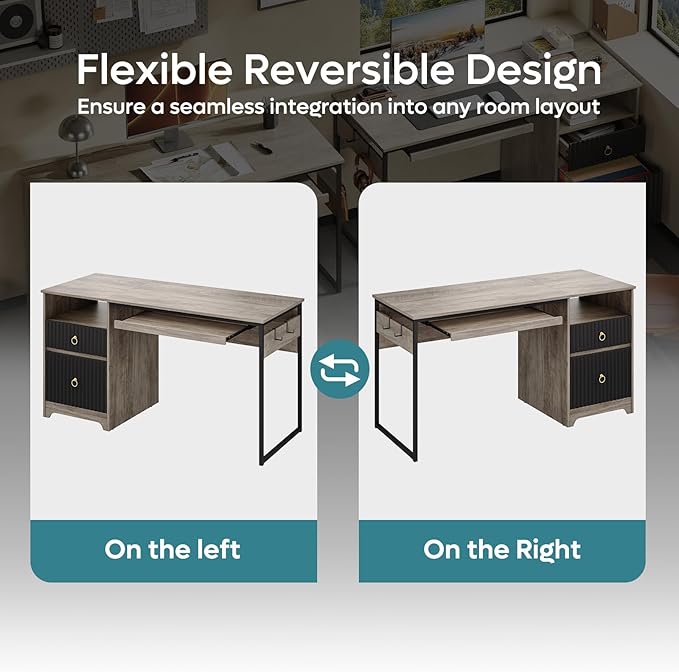 • User-Friendly Design: The home office desk features a flexible keyboard tray for comfortable typing. Its reversible pedestal can be installed on either the left or right side, ensuring seamless integration into any room layout. Additionally, two practical hooks provide convenient storage for headphones or other accessories