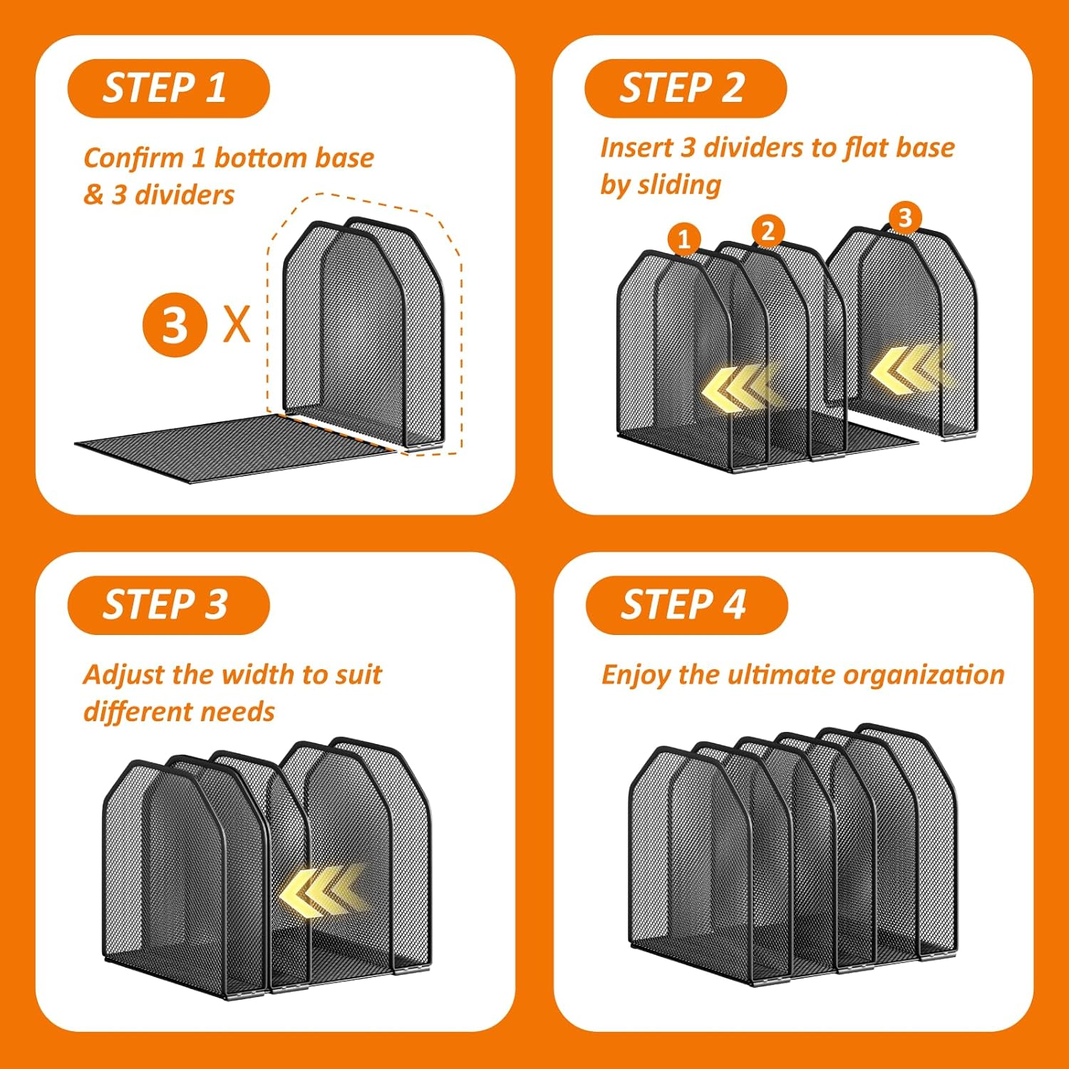 • Adjustable 5 Sections Desktop File Organizer: Featuring 5 sections and 3 adjustable freestanding dividers, The 3 divider sections attach by sliding bottom onto the flat base, you can adjust the width between the mesh dividers depending on what you want to put in each section to make it wider or more narrow. 3 movable frame allows you to freely adjust size to suit different needs, it adapts to fit store files, books, laptops, and more, keeping everything within reach for ultimate convenience.