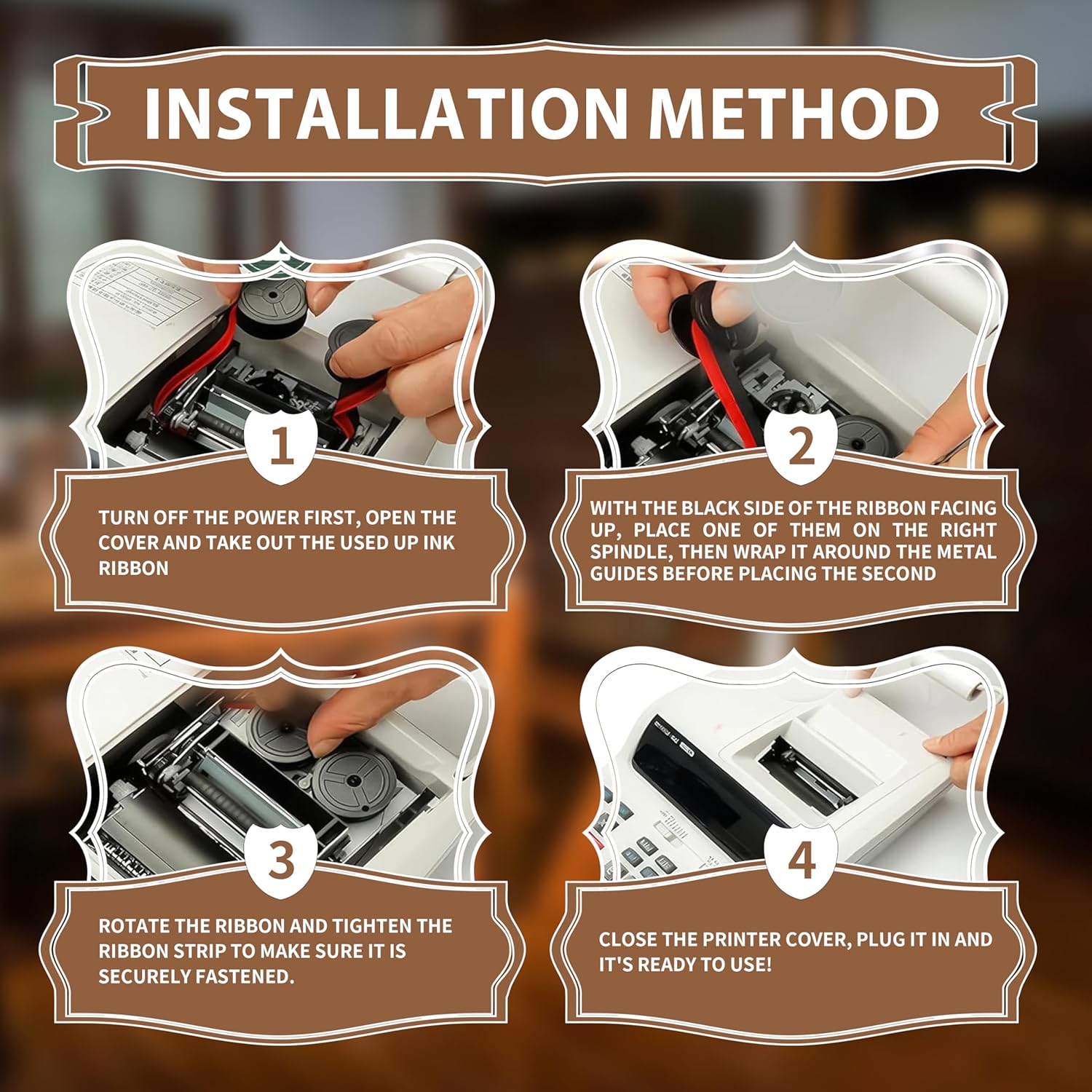 • SIZE SPECIFICATIONS: The kit includes 4 packs of Sharp printer ribbons, each approximately 16 feet long, with a spool diameter of 1.37 inches and a width of 0.5 inches, and each pack is individually wrapped to ensure a longer life for the ink!