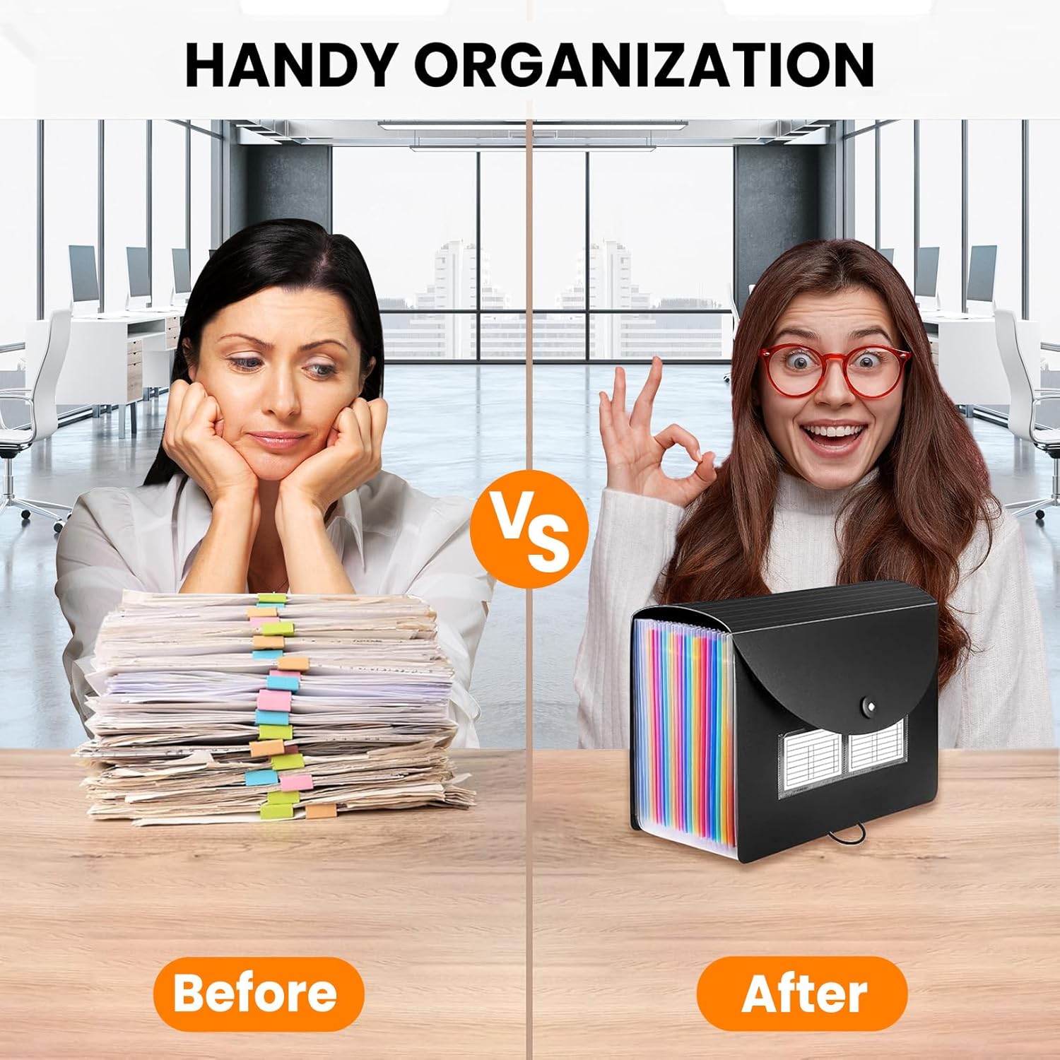 • Handy organization & Easy lookup: Expandable file folder has 24 pockets designed for keeping our paperwork organized. Accurately classified storage in the specific color slot and labeled with tabs, so it is easier to find the papers what is needed.