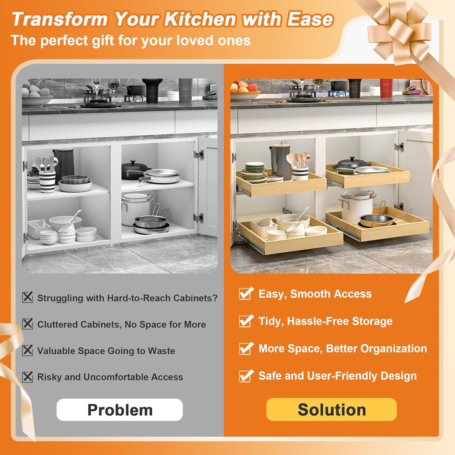 • Soft-Close & Heavy-Duty Slides: These cabinet pull out shelves feature full-extension soft-close slides for smooth, quiet performance. Designed for everyday convenience, the pull out cabinet drawer makes it easy to access hard-to-reach items, helping you stay organized and maximize your storage space