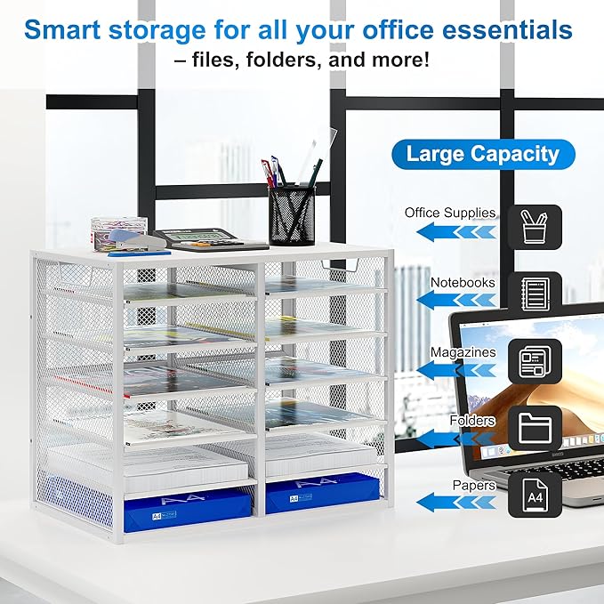 • ▶Amazing Storage Capacity and Space-saving. The literature organizer has 12 compartments, which can help you sort, store and organize literature, magazines, comic books, files, student assignments, binders, catalogs, diaries, papers and documents on your desk or counter quickly and easily and get you valuable workspace back