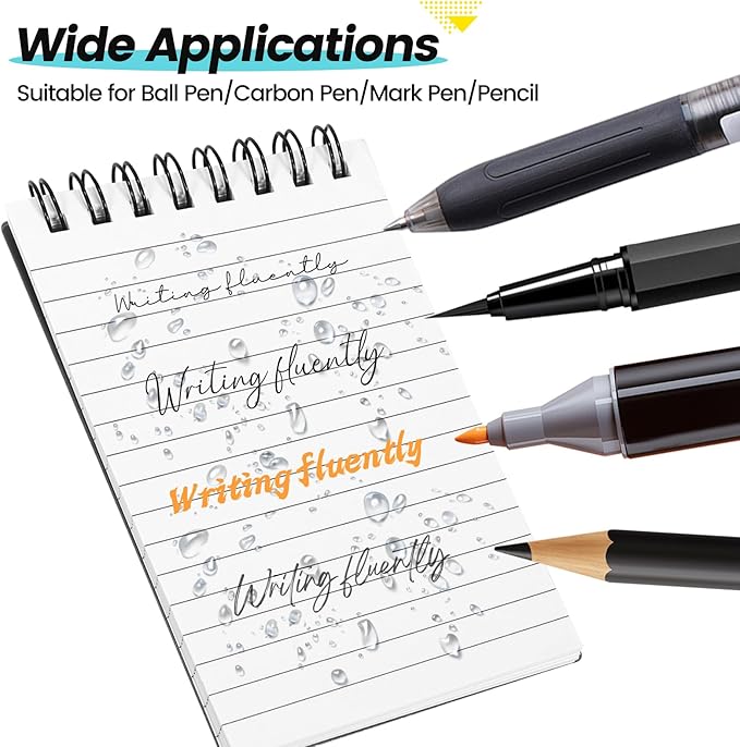 • Write in the Rain: You can write freely in the rain, as water will not seep into the pages and erase your handwriting. When the paper dries, ballpoint pens and permanent markers work effectively. The small notebook is durable in all weather conditions, such as travel, camping, office, and outdoor settings, making it an ideal all - weather waterproof spiral notebook.