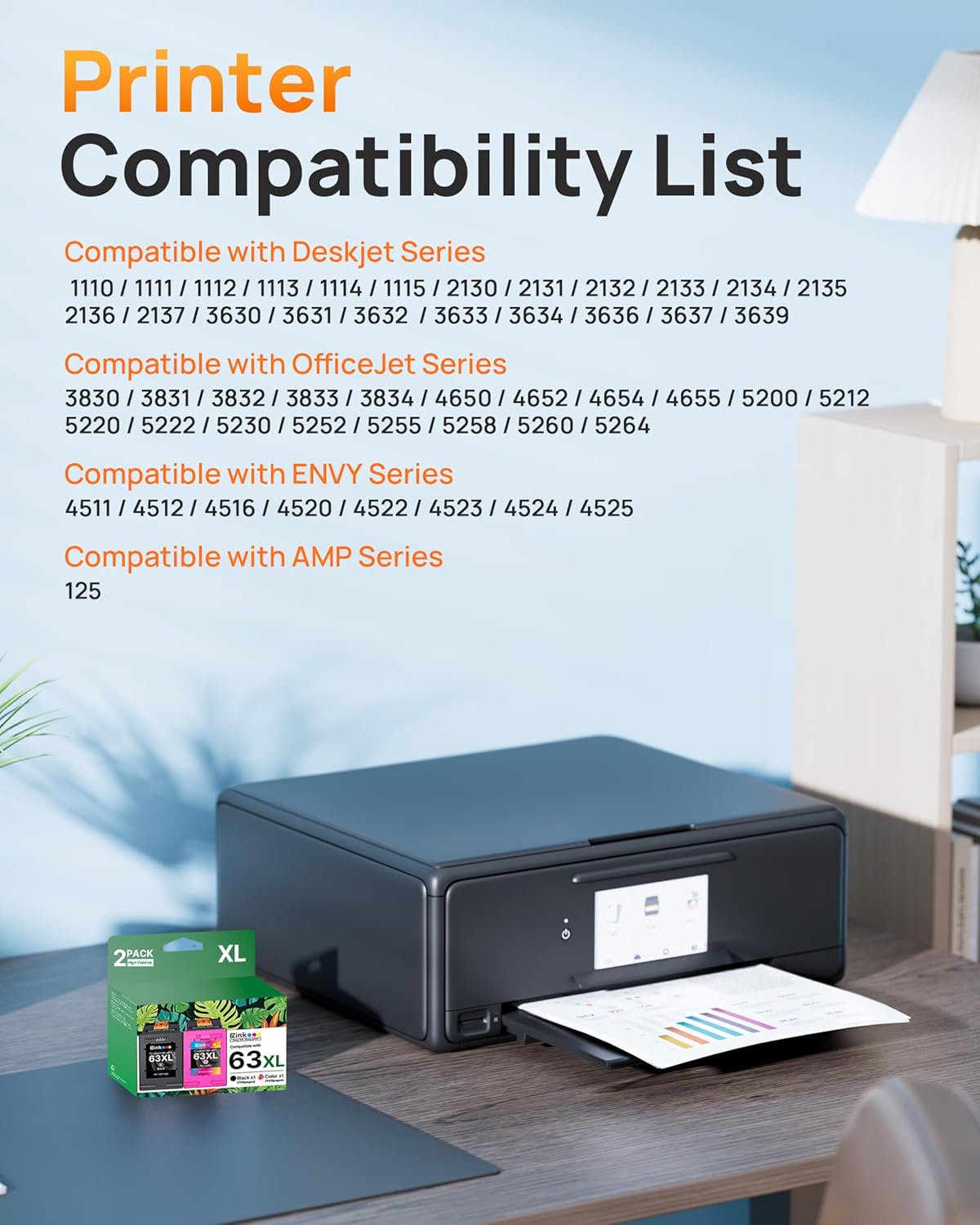 • Package Contents: 1x 63xl black replacement for hp 63xl ink cartridge, 1x 63xl color printer ink, total 2 pack replacement for hp 63xl ink cartridges combo pack with user guide