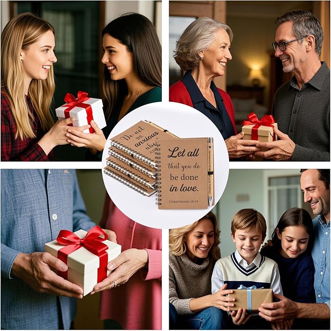 • Inspirational Scripture Notebook Set – This set includes 20 spiral notebooks and 20 bamboo pens, featuring 5 different Bible verses (4 notebooks and 4 pens per verse). A meaningful and practical bundle for note-taking, study, and gifting.