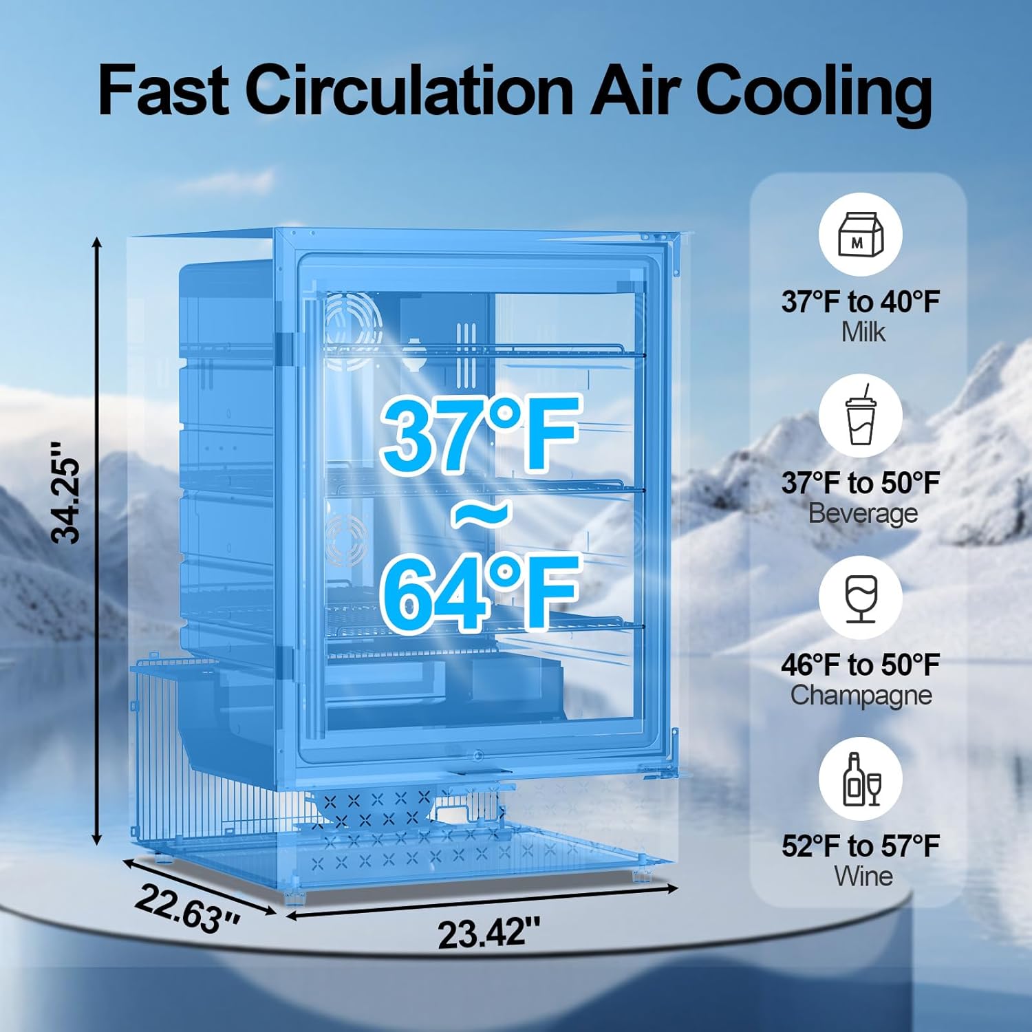 • DUAL-LAYER TEMPERED GLASS DOOR: Featuring a dual-layer tempered glass door with a seamless design, this mini drink fridge not only enhances its aesthetic appeal but also effectively insulates against external heat. The lockable door prevents accidental openings by children or pets. Additionally, it comes with blue LED lighting. The beverage refrigerator with glass door is equipped with a sensitive temperature sensor chip with memory function, meaning it will automatically return to the previous set temperature after a power outage and recovery.