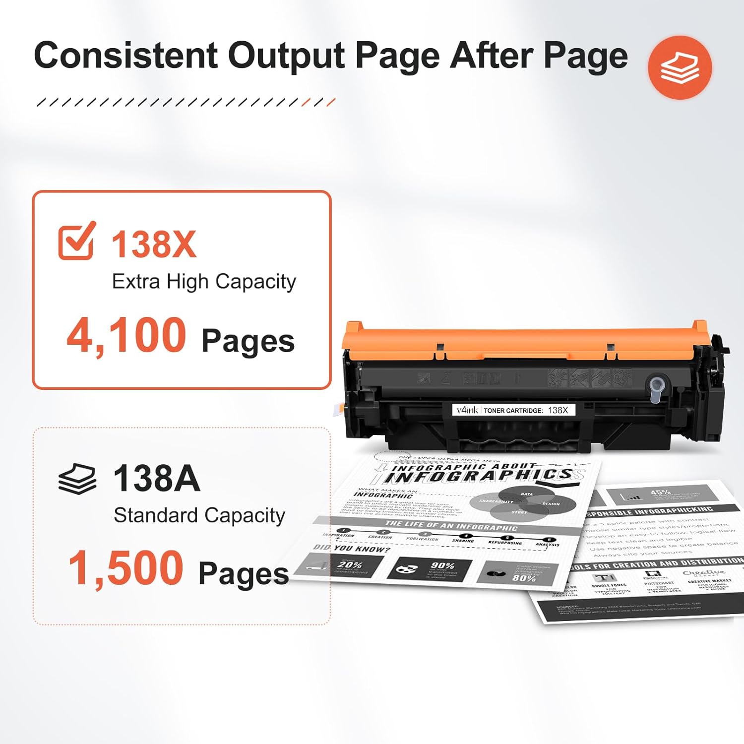 • Print More, Spend Less: 4,100 pages per v4ink 138X Black toner cartridge at 5% coverage (Letter/A4). More than 2X the other 138A W1380A toner cartridge Page Yield