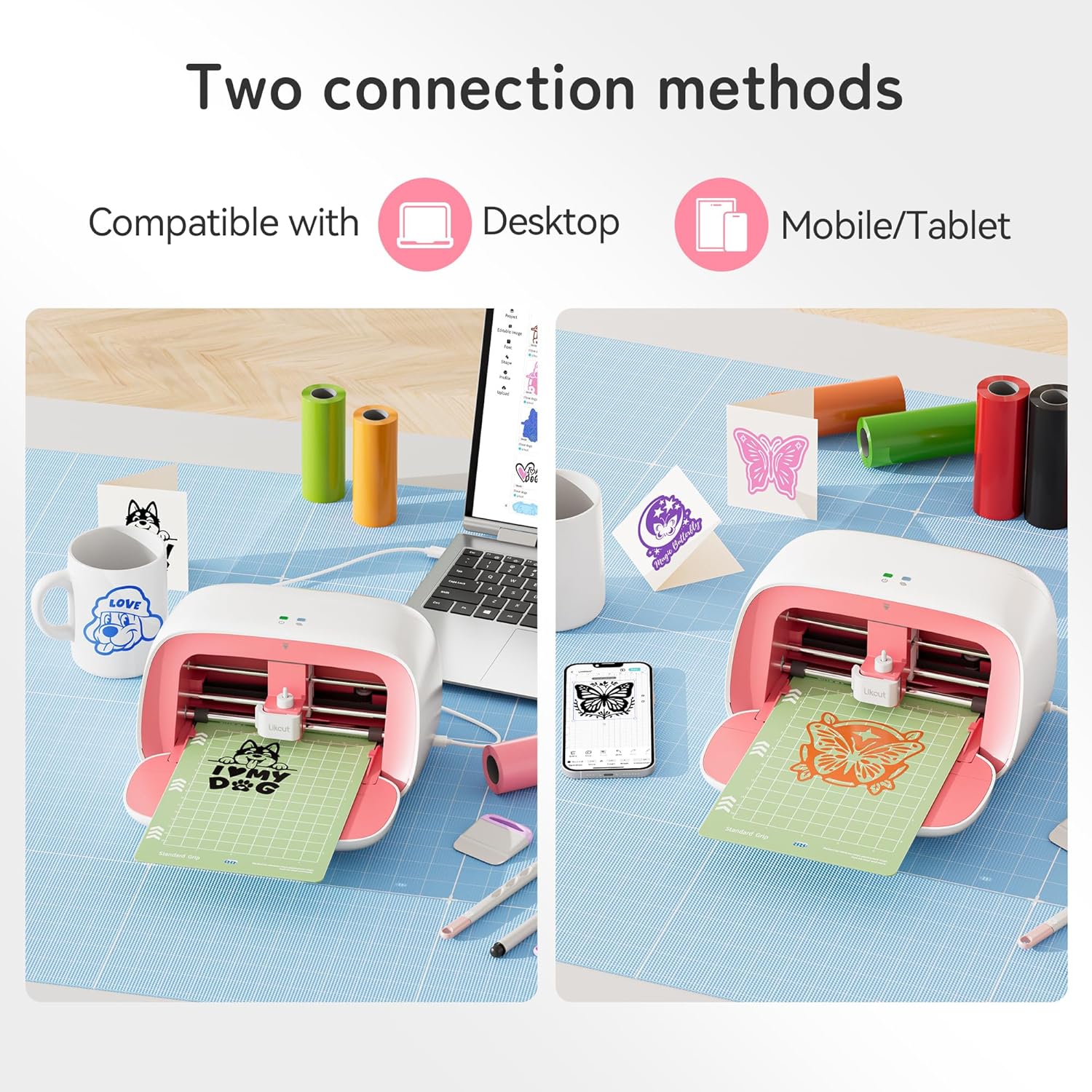 • Likcut Portable S501 Vinyl Cutter: Stylish & functional design, soft pink and white die cutting machine doubles as a chic desktop accessory, 200.8*165.6*124.3mm and 1.95 kg for easy portability and storage, with front storage compartment keeps workspaces organised – no more misplaced tools mid-craft
