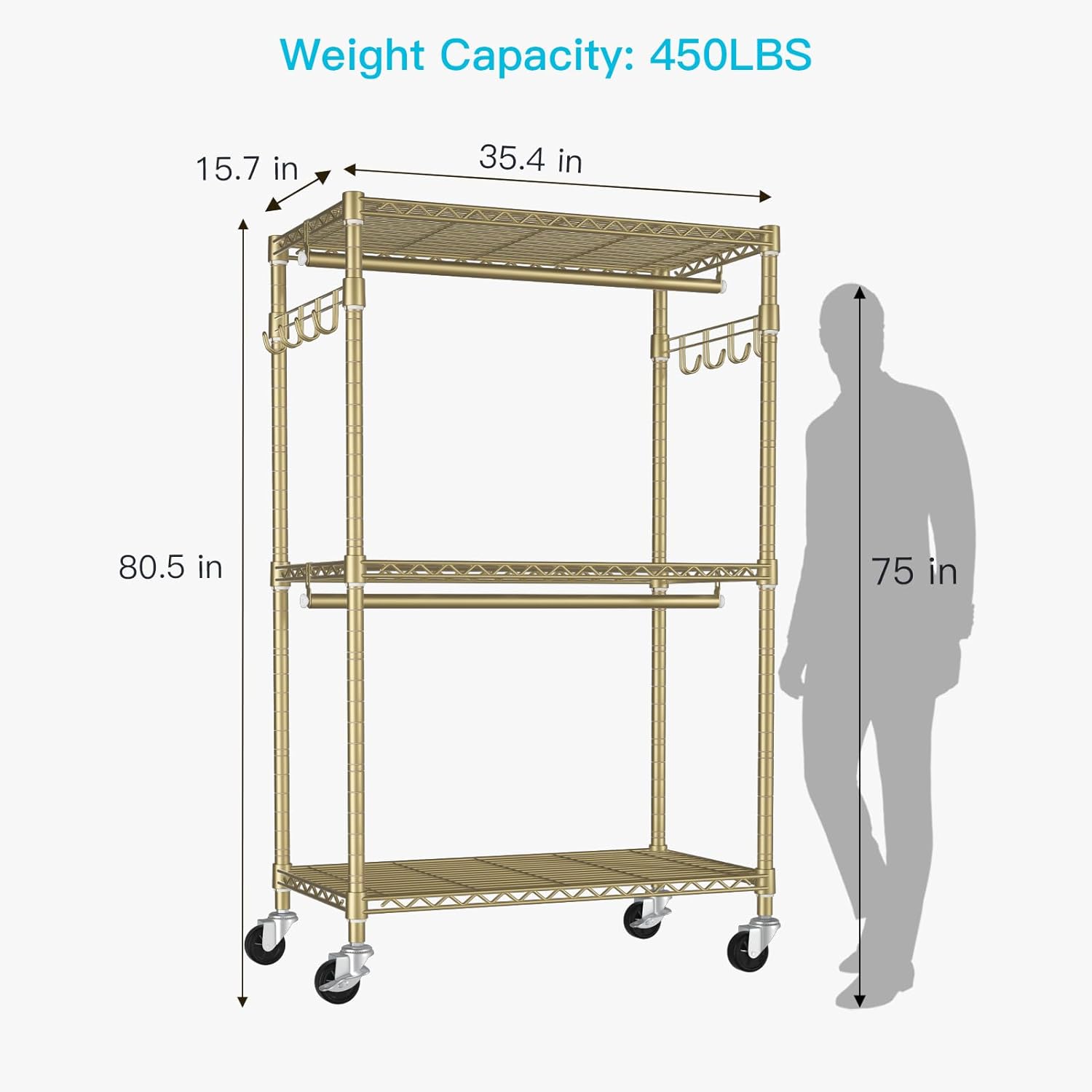 • [Dimension & Load Weight]: 35.4"W x 15.7"D x 80.5"H(Included wheels height). Weight Capacity: 450 LBS. You can move the clothing rack freely when needed