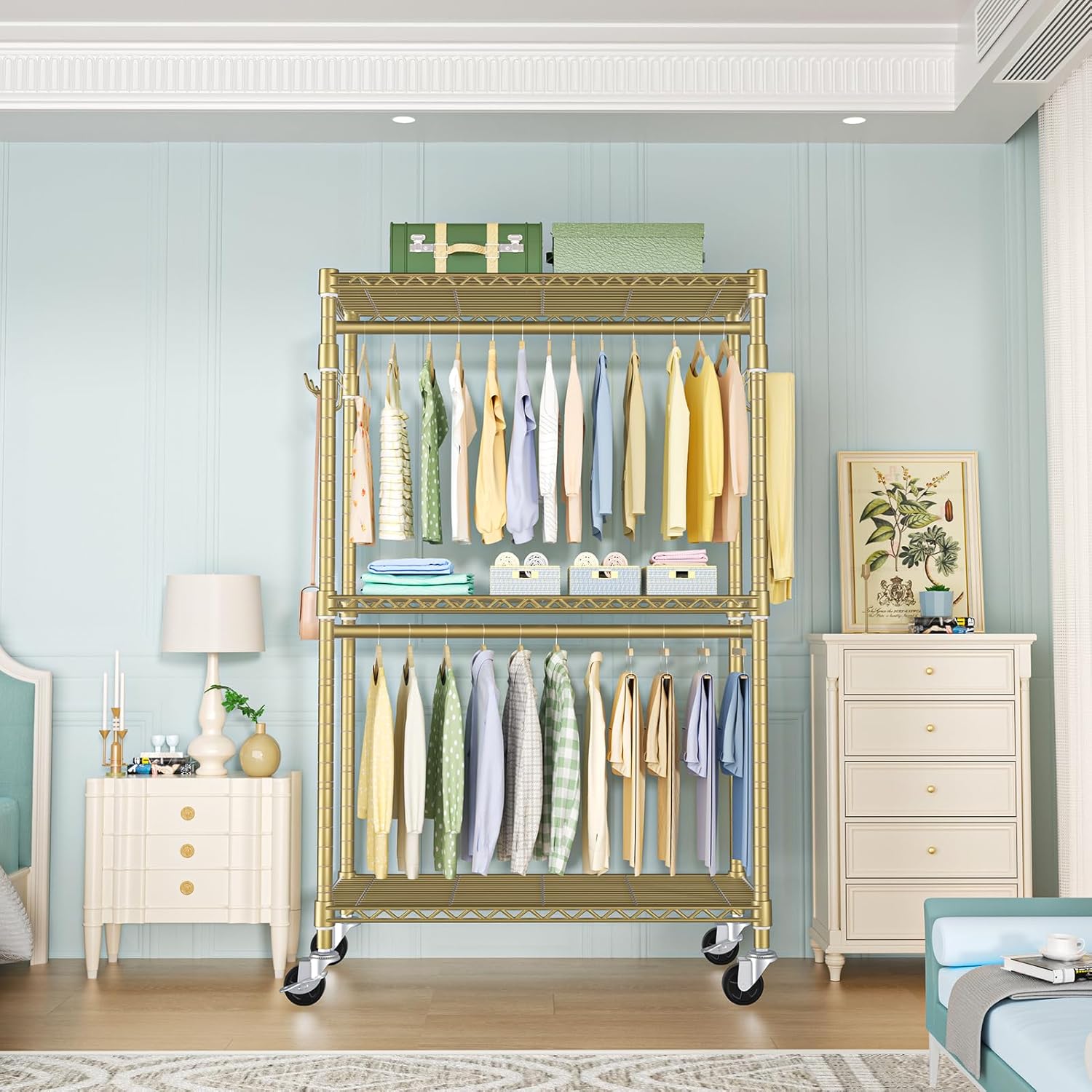 P1 Rolling Clothes Rack, Movable Metal Garment Closet Organizer with Lockable Wheels, Clothing Wardrobe with Double Hanger Rods and Hooks, 35.4" W x 15.7" D x 80.5" H, Load 450lbs, Gold