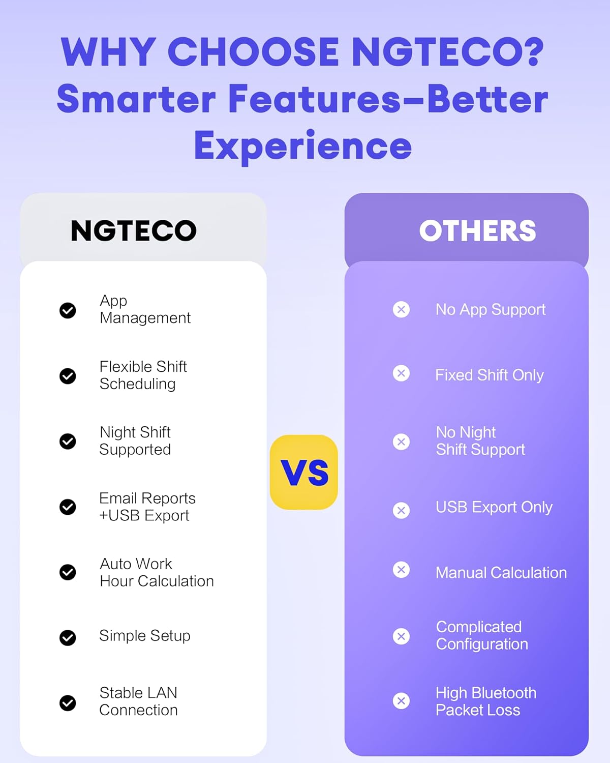 • Eco-Friendly & Paperless Solution: Say goodbye to paper time cards with the K4. It supports unlimited daily punches, reducing printing errors and saving costs on supplies. The NGTeco Time App allows easy setup of pay periods, attendance rules, and report downloads from your smartphone (requires 2.4G Wi-Fi).