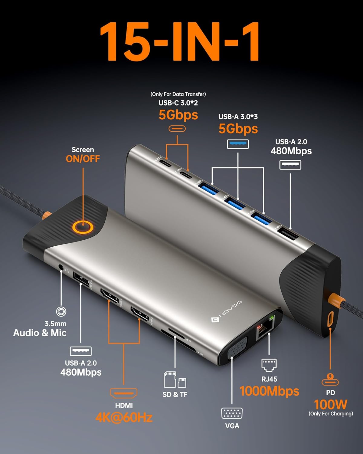 • 15 in 1 USB C Docking Station: NOVOO USB C HDMI Multi-Port hub with Screen Switch, Dual 4K HDMI Ports, 2*USB-C 3.0 Data Ports (Up to 5Gbps), 1*USB C PD100W charging port, 3*USB-A 3.0 Ports, 2*USB-A 2.0 Ports, Gigabit RJ45 Ethernet, VGA, SD/Micro SD Card Reader and 3.5mm Audio/Mic Port. Plug and play for your many needs.