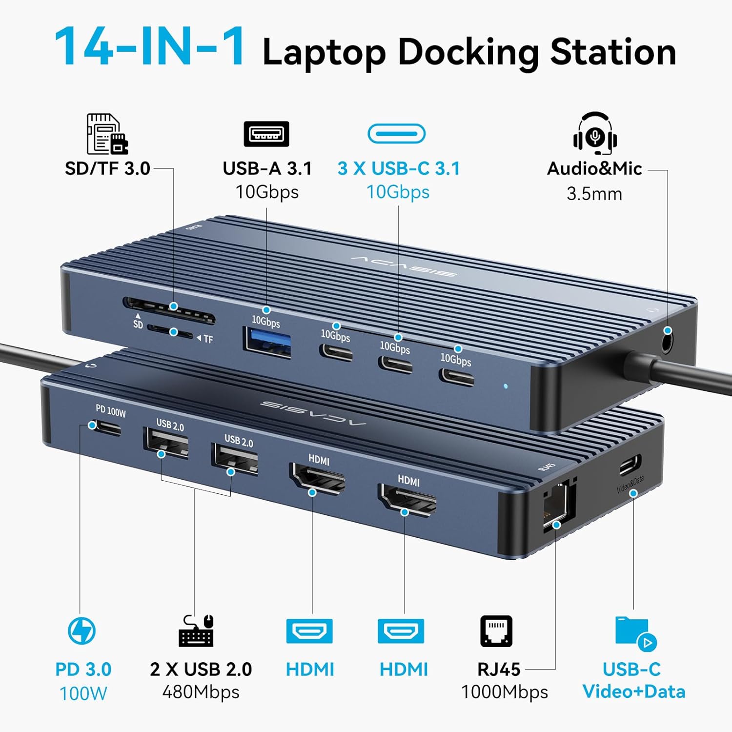 • 【14-IN-1 USB C Video Hub】Plug and play,ACASIS USB C Docking Station Dual Monitor easily expands your laptop from a single USB C/thunderbolt 3/4/type C port to a 14-port mobile workstation, This Docking Station with 2*HDMI + 4 *USB C 3.1-10Gbps + 2*USB 2.0,+SD/TF card reader+1000Mbps Ethernet+3.5mm audio and microphone+ PD 100W charging, as well as a full-featured USB C video port.