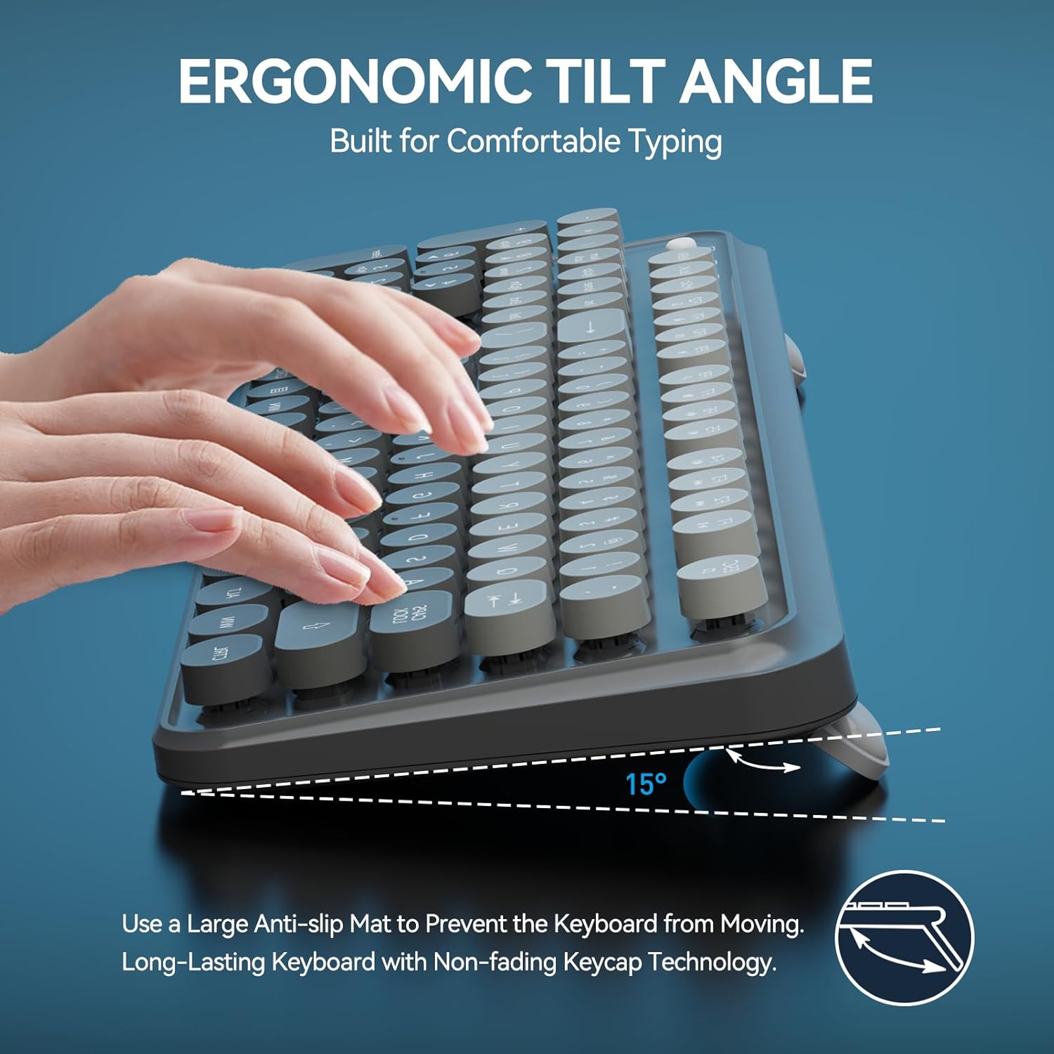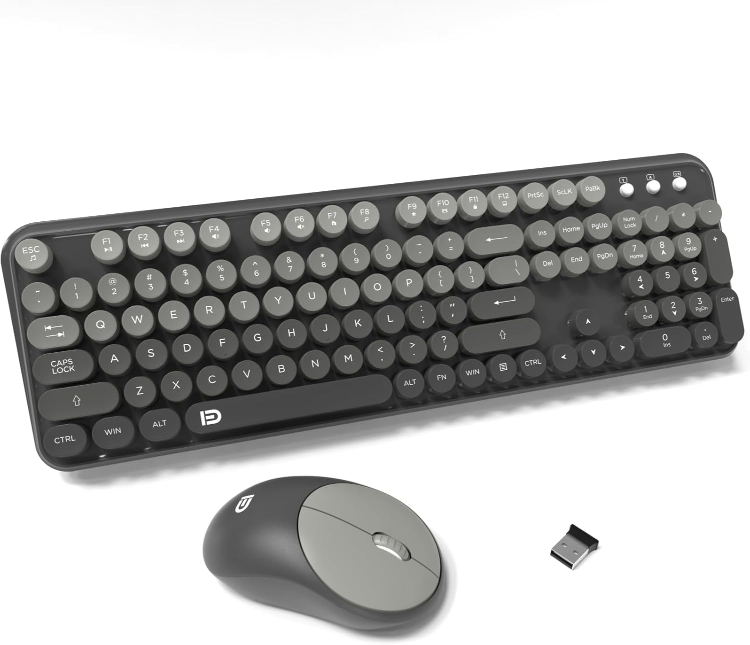 FOPETT Wireless Keyboard and Mouse Combo - Cute Colorful Mouse and Keyboard 2.4G Full-Sized with 104 Round Keys Retro Typewriter Keyboards for Laptop/Windows/PC - Grey Gradient