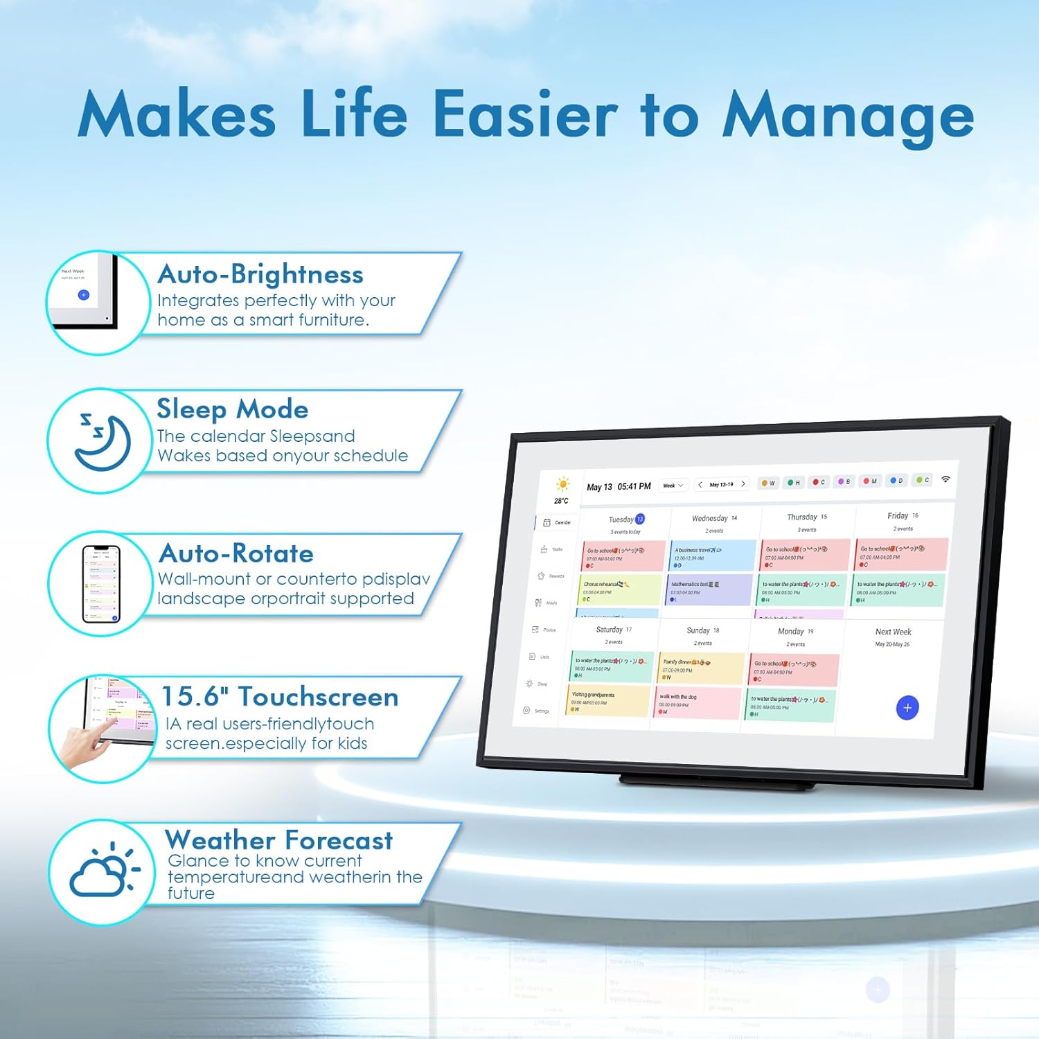 • ❤Seamless Scheduling: Smart digital calendar, effortlessly create and manage events, appointments, and reminders. with just a few clicks. Our 15.6" Full HD touchscreen intuitive interface makes scheduling a breeze, whether it’s a crucial meeting or a family gathering. The perfect gift for mom who keeps everyone organized.