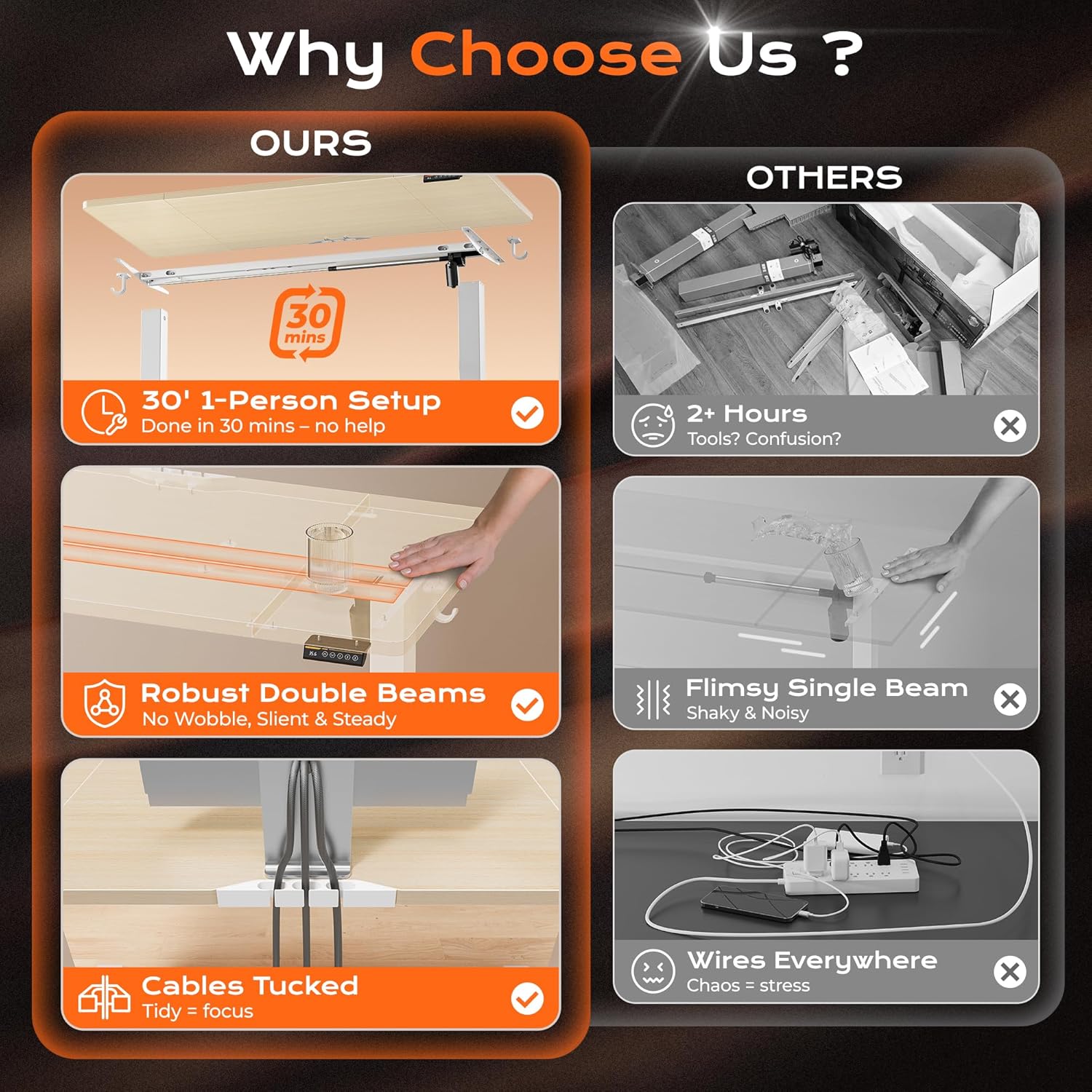 • 【Advanced Safety Features】Equipped with anti-collision technology, the stand desk automatically reverses direction upon encountering an obstacle, protecting your belongings and ensuring safe operation. Adjustable feet below the adjustable desk keep it stable anytime, anywhere
