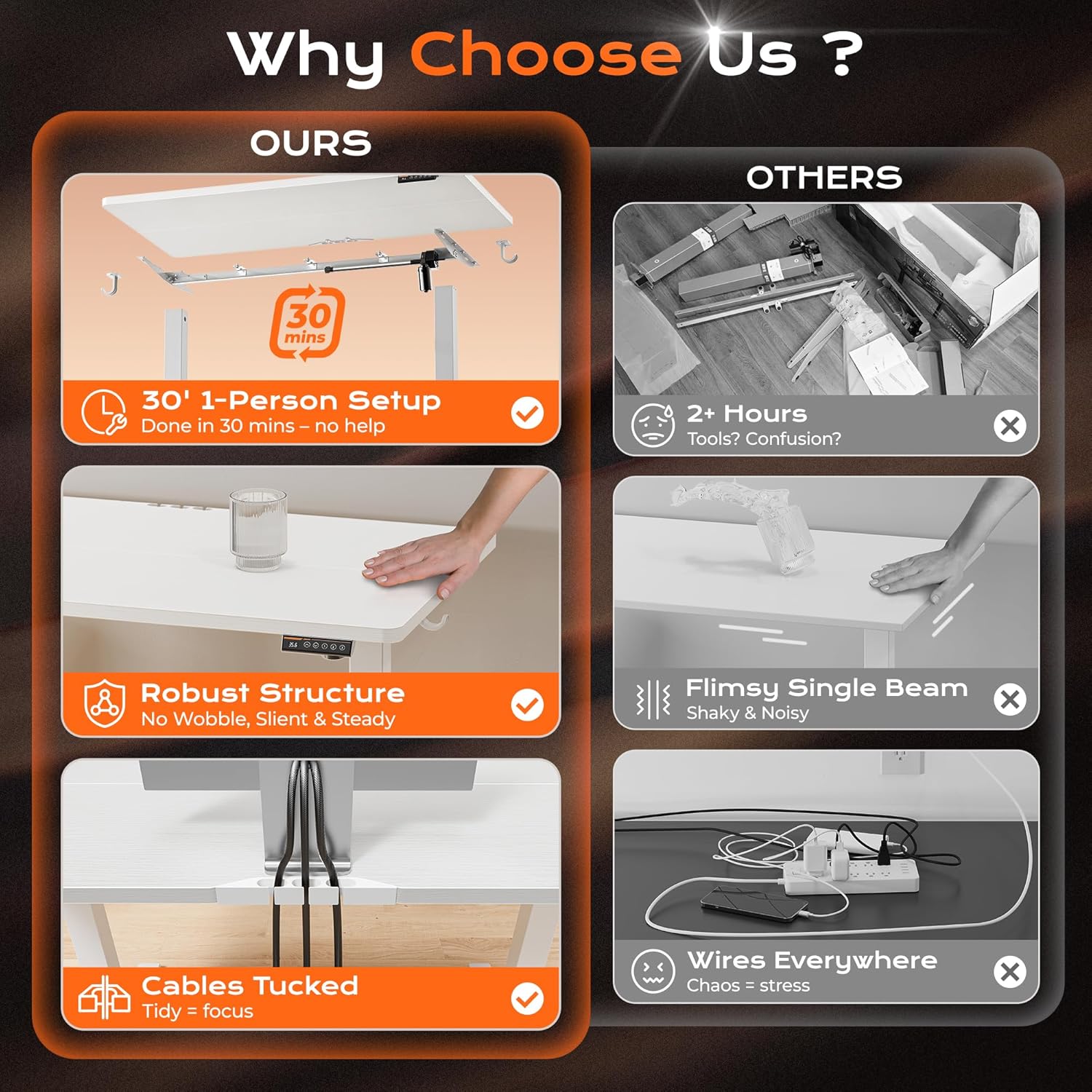 • 【Whisper-Quiet Operation】Powered by a robust yet quiet motor (operating at less than 45 DB), the wide deep desk brings smooth height adjustments without disturbing your household or office environment. This standup desk for home office is ideal for keeping focus and slient