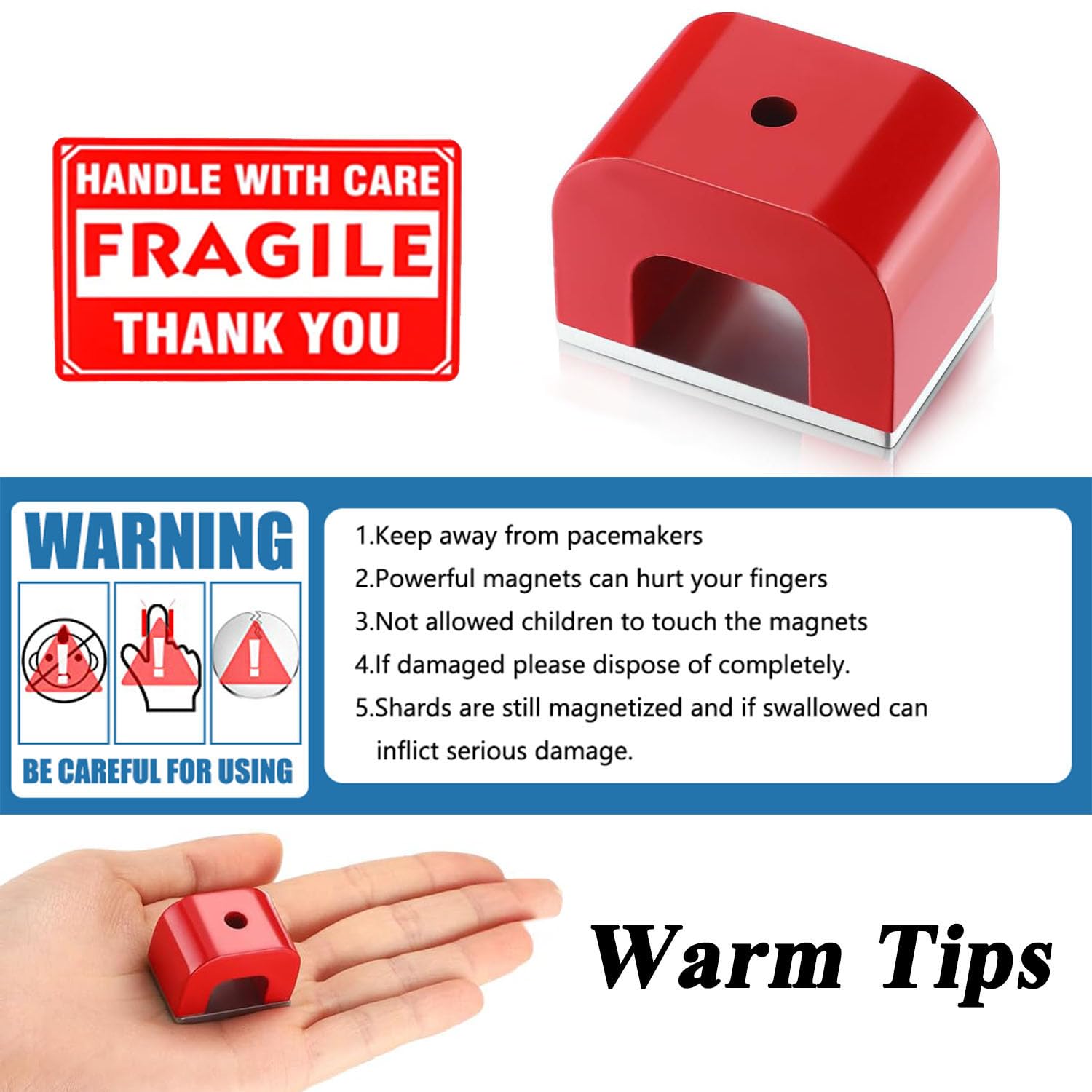 • Warm Tips: 1. Stay away from the pacemaker 2. If breakdown, discard immediately 3. Strong magnetism, be careful to hurt your fingers