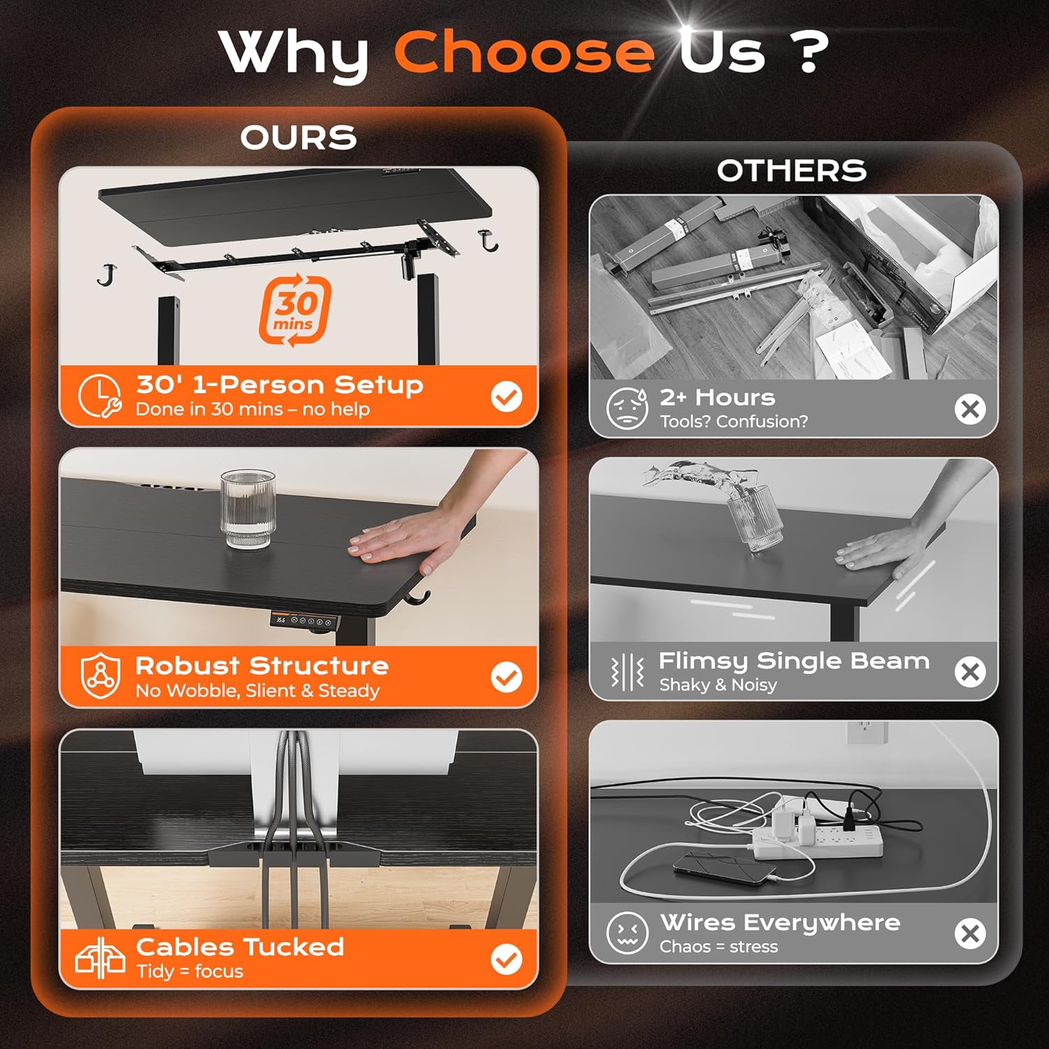• 【Advanced Safety Features】Equipped with anti-collision technology, the stand desk automatically reverses direction upon encountering an obstacle, protecting your belongings and ensuring safe operation. Adjustable feet below the adjustable desk keep it stable anytime, anywhere