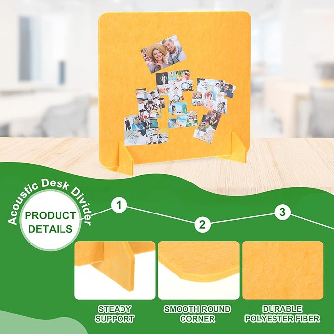 • Specification: Material: Polyester Fiber; Size: 600 x 600 mm/23.6 x 23.6 Inch(L*W); Thickness: 9mm/0.4 Inch; Color: Yellow; Packing List: 2 Sets x Desk Dividers(Each Set includes 1 Pcs x Divider and 2 Pcs x support feet)