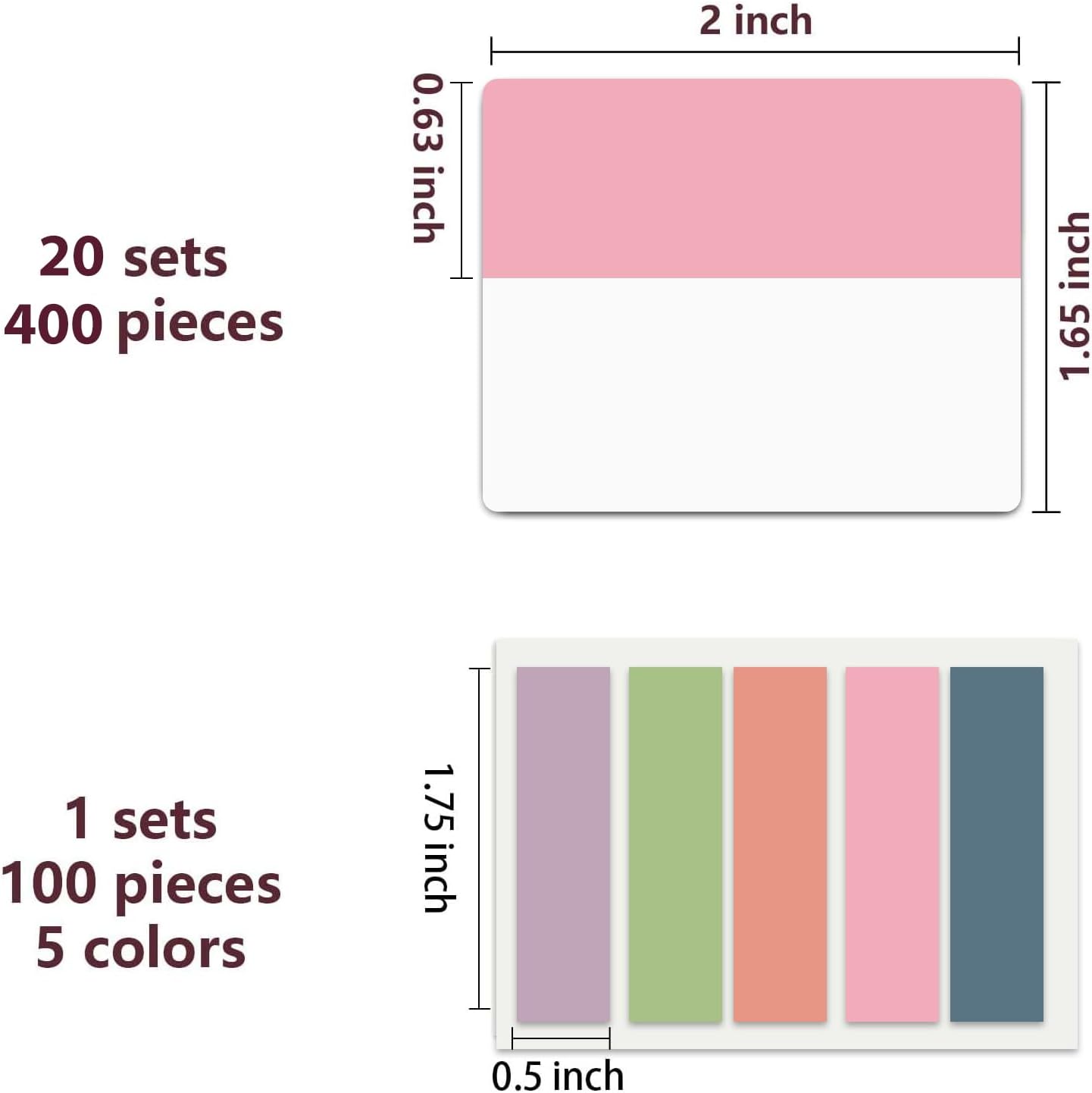 • Sticky Tabs: 500 pieces 21 sets in total, 400 pieces 2 inch sticky tabs in 20 sets with different pastle colors,100 pieces 0.5 in tabs in 1sets, 20 pieces each color