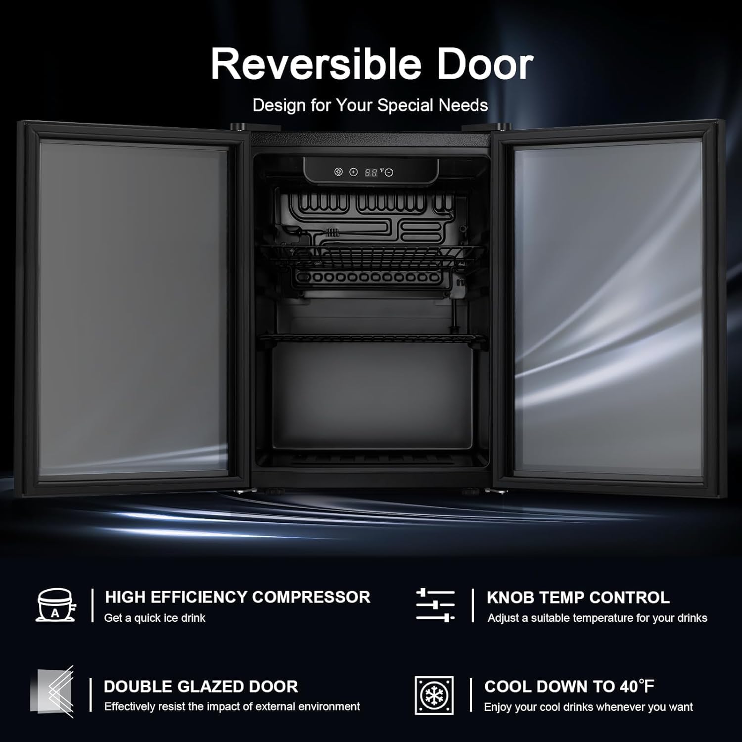 • Intelligent Control:This Beverage Refrigerator has digital Thermostatic controls to adjust the temperature between 40°F-61°F with an easy-to-use digital display. The coolers for home feature a special compressor technology that keeps the temperature constant regardless of the outer oscillations.