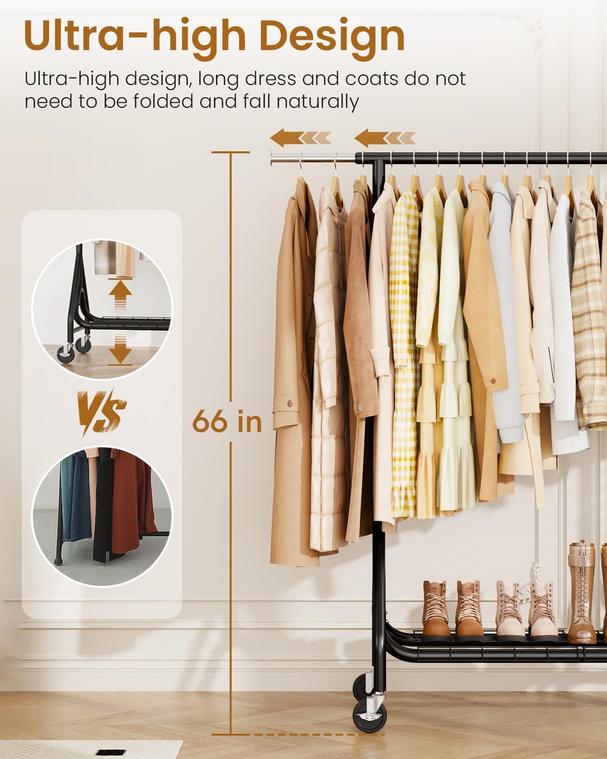 • ๐™Ž๐™๐™๐™๐˜ฟ๐™” ๐˜ผ๐™‰๐˜ฟ ๐™Ž๐™๐˜ผ๐˜ฝ๐™‡๐™€ ๐˜พ๐™Š๐™‰๐™Ž๐™๐™๐™๐˜พ๐™๐™„๐™Š๐™‰: Our clothes rack adopts an innovative one-piece rod design, which ensures that the clothing rack are evenly supported, preventing sagging or bending. The triangle on the sides and dual U-shade rods on the bottom make the heavy duty clothing rack more stable and sturdy. The rolling rack can hold up to 450 pounds, so you can hang up heavy clothing, place luggage and more without worry.