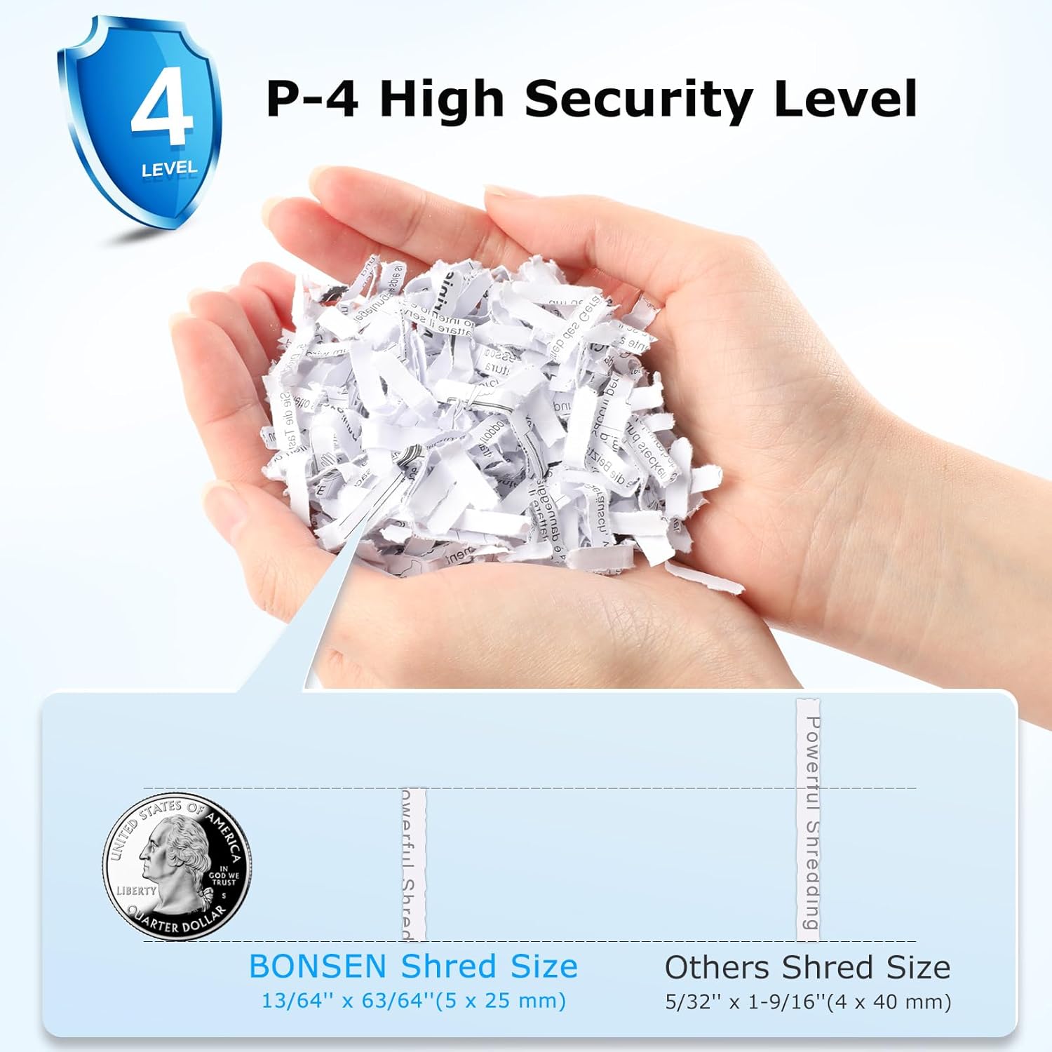 • Protect Sensitive Data with Confidence: Achieving a P-4 high-security level, BONSEN home office paper shredder heavy duty can efficiently shreds sensitive documents into tiny particles measuring just 13/64 x 63/64 inches (5 x 25 mm) to keep your information safe.