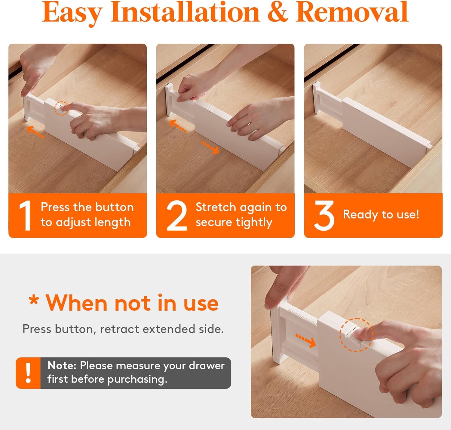 • Easy Installation & Removal: Press the top button to adjust the length before placing, and stretch it out again to secure it tightly before locking it. The strong spring tension keeps each drawer organizer securely upright. To retract, press the top button and push the stretched side