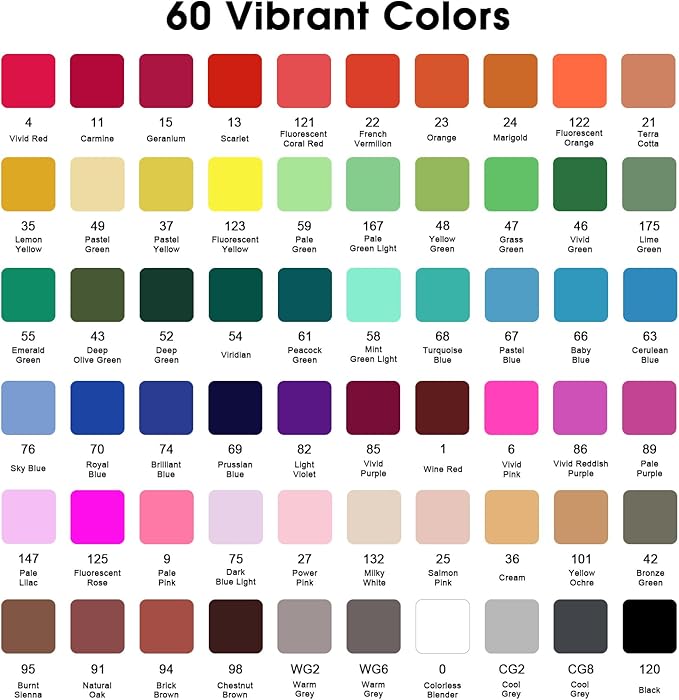 • Vibrant Blendable Colors: Unleash your creativity with 60 colors brush tip alcohol markers featuring ultra-smooth alcohol-based ink that blends seamlessly. Perfect for adult coloring books, these no-bleeding coloring markers deliver rich, fade-resistant hues for professional illustrations, manga art, or casual sketching.