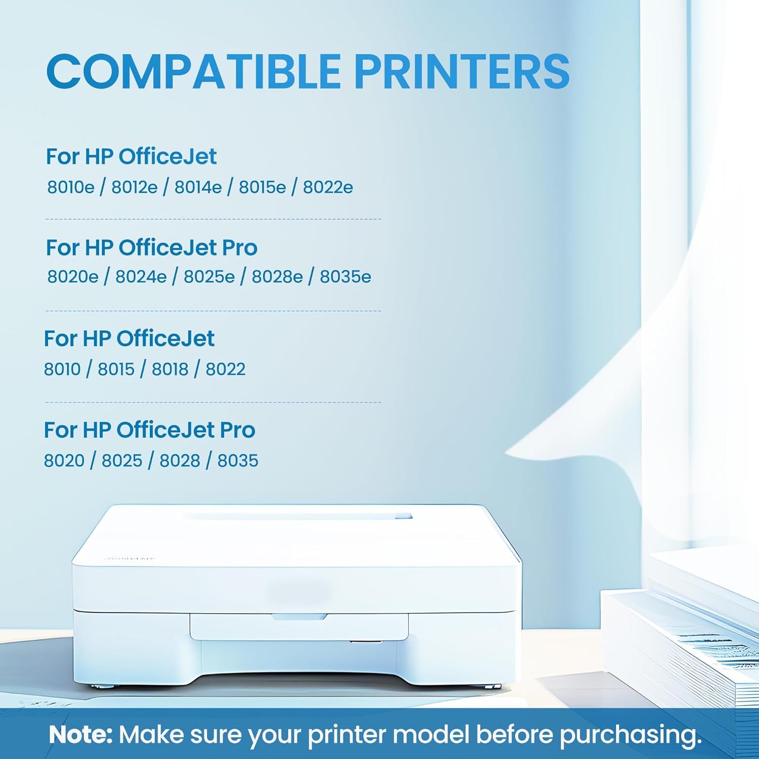 • Printer Compability: Compatible with (1) HP OfficeJet 8010, 8010e, 8012e, 8014e, 8015, 8015e, 8018, 8022, 8022e; (2) HP OfficeJet Pro 8020, 8021,8020e, 8024,8024e, 8025, 8025e, 8028, 8028e,8030,8030e, 8035, 8035e Printer.