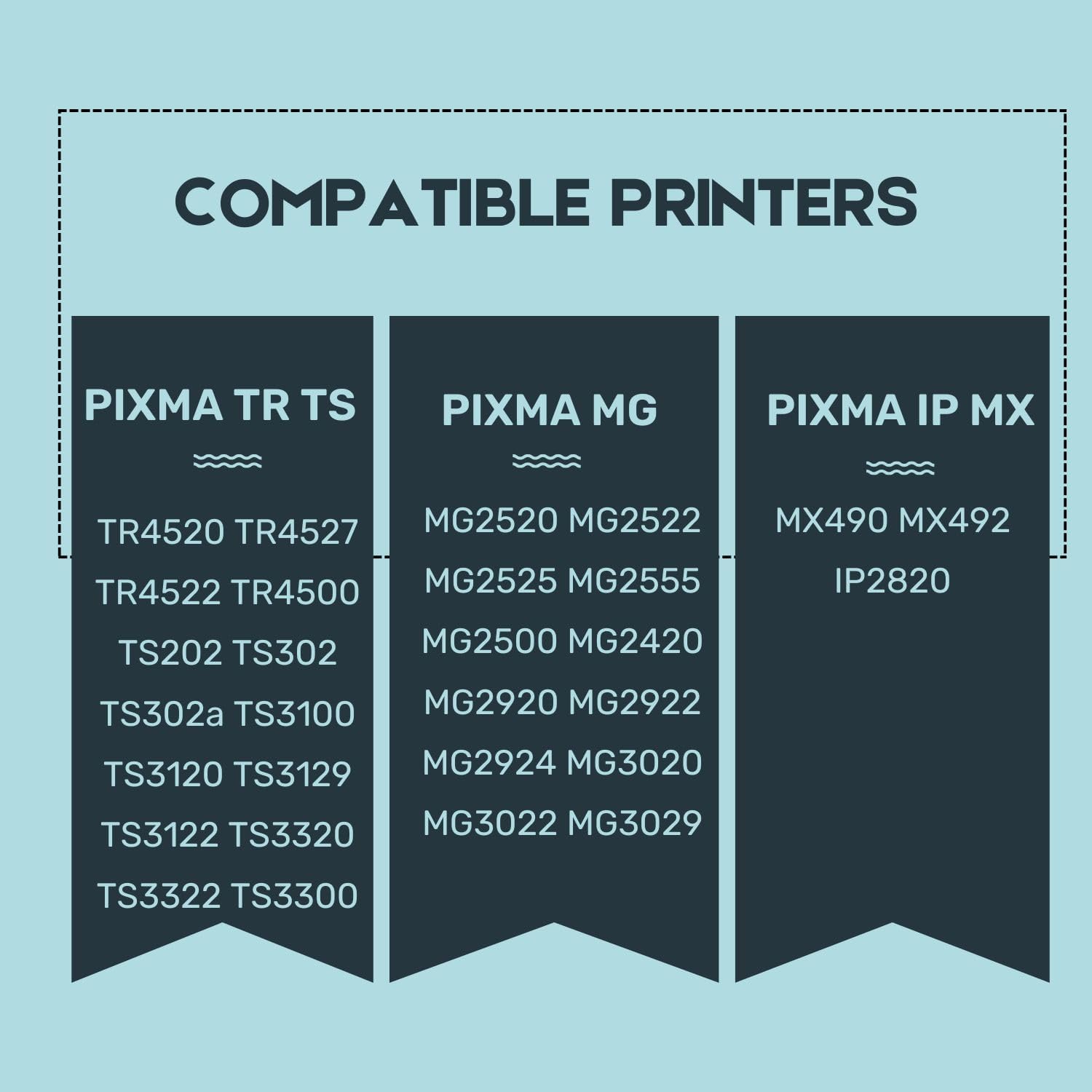 • Compatible printers: with PIXMA TR4520, TR4527, TR4522, TR4500, MX490, MX492, IP2820, MG2520, MG2522, MG2525, MG2555, MG2500, MG2420, MG2920, MG2922, MG2924, MG3020, MG3022, MG3029, TS202, TS302, TS302a, TS3100, TS3120, TS3129, TS3122, TS3320, TS3322, TS3300.
