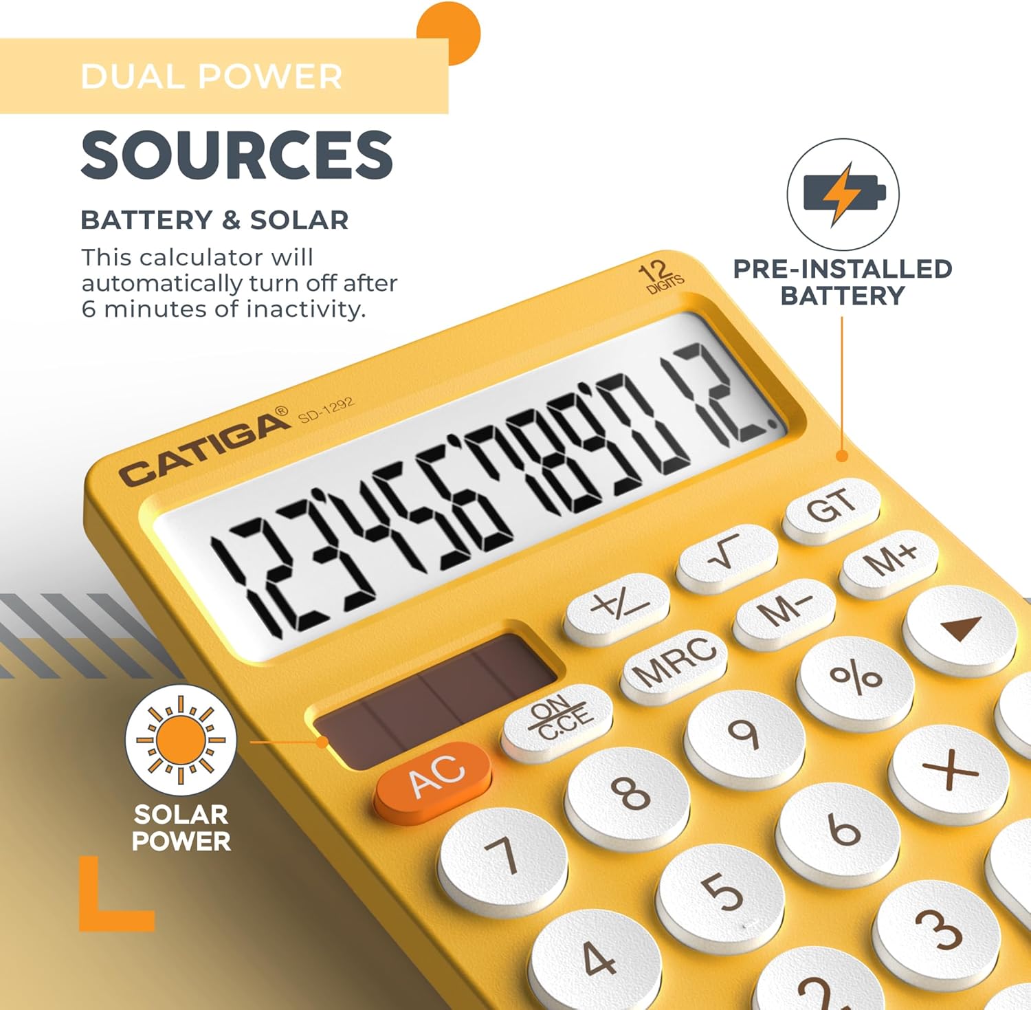 CATIGA 12 Digit Desktop Calculator Basic Desk Calculator with Large LCD Display, Big Buttons, 4 Function, Solar and Battery Dual Power, for Office, School, Home, SD-1292 Yellow