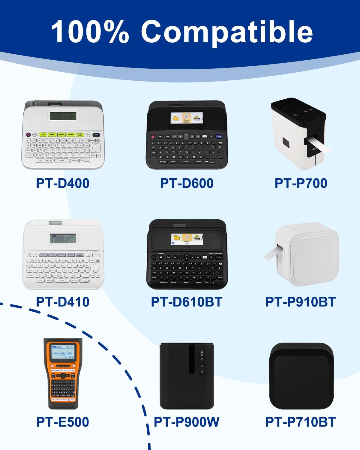 • Compatible with Brother Ptouch Label Maker: PT-D400, PT-D600, PT-D410, PT-D460BT, PT-D610BT, PT-D400AD, PT-D400VP, PT-D600VP, PT-P710BT, PT-P750W, PT-P700, PT-2730VP, PT-H500LI, PT-2730, PT-2430PC, PT-D450, PT-1880, PT-1830, PT-1890SC, PT-2300, PT-300, PT-310, PT-E300, PT-E300VP, PT-E500, PT-E550W, PT-520, PT-530, PT-540, PT-550, PT-1400, PT-1500, PT-1500PC, PT-1600, PT-2110, PT-2200, PT-2210, PT-2300, PT-2310, PT-2400, PT-9700PC ect