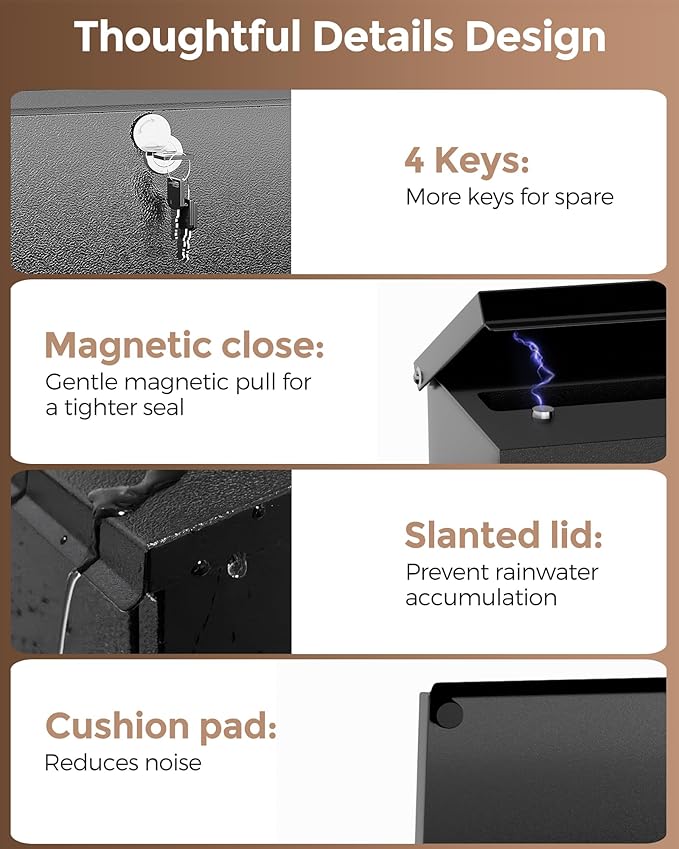 • [Thoughtful Details]: Our mailbox provide you with four keys, no need to worry about keys lost or not enough; the lid is equipped with a black pad, which can be opened and closed quietly; the magnet can make the lid close more tightly through magnetic force, always keeping the contents in the box dry and intact