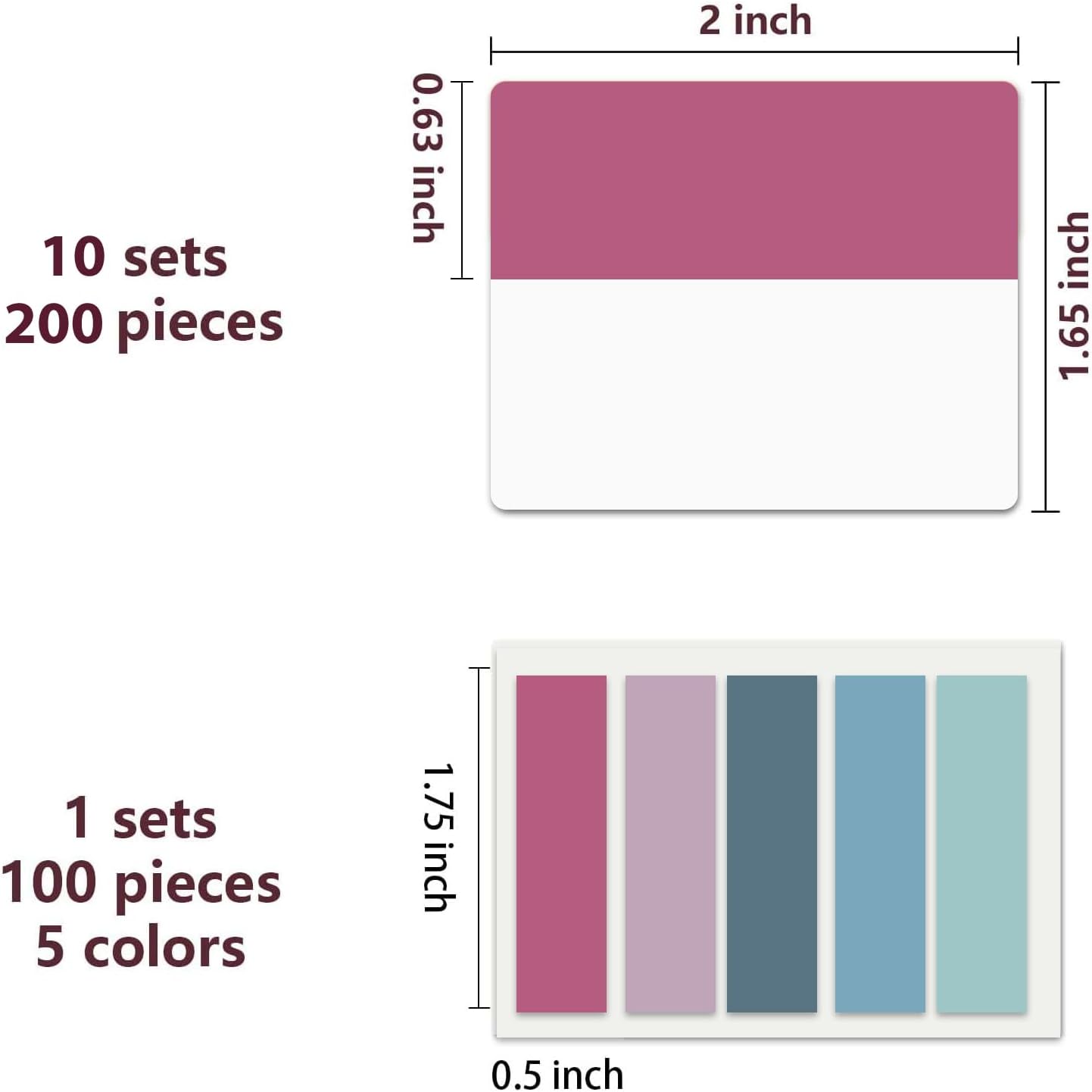 • 300pcs Book Tabs: 300 pcs 21 sets in total, 200 pieces 2 inch sticky tabs in 10 sets with different pastle colors,100 pieces 0.5 in tabs in 1sets, 20 pieces each color