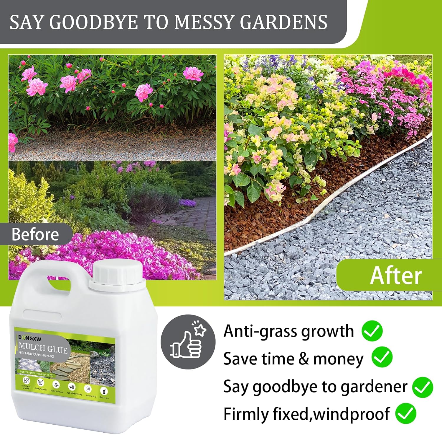 • Strong Adhesion Mulch Glue for Landscaping: Dongxw’s powerful mulch glue securely holds rocks, gravel, rubber mulch, and wood chips in place, minimizing erosion and preventing displacement from wind and rain while allowing water and essential nutrients to penetrate the soil, curbing weed growth and promoting a healthy landscape.